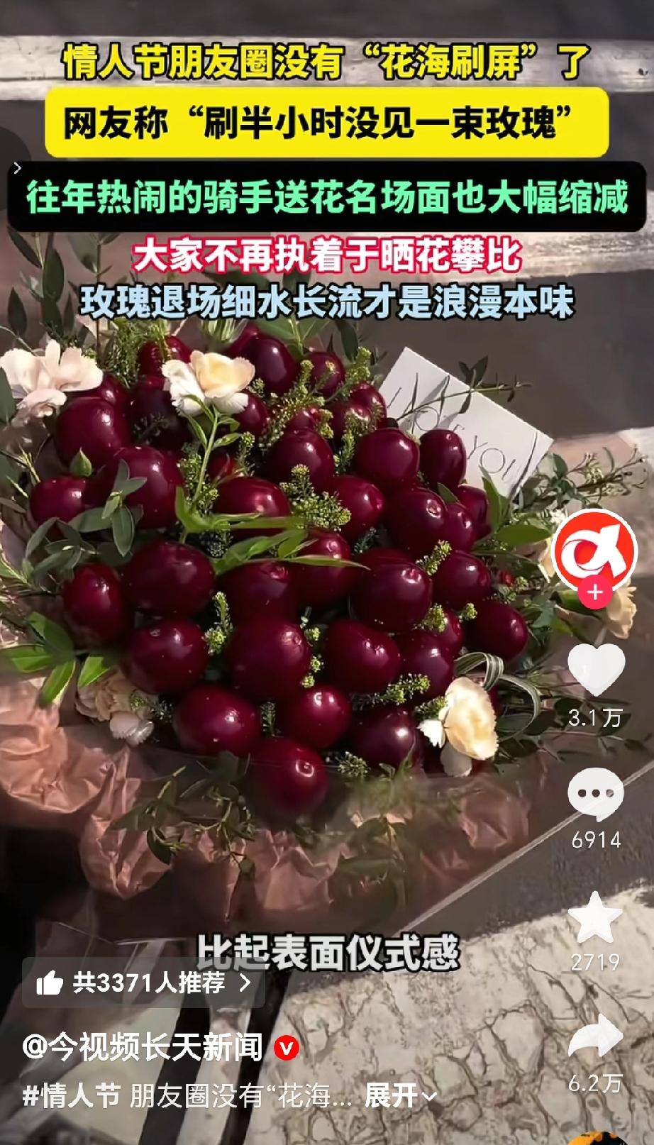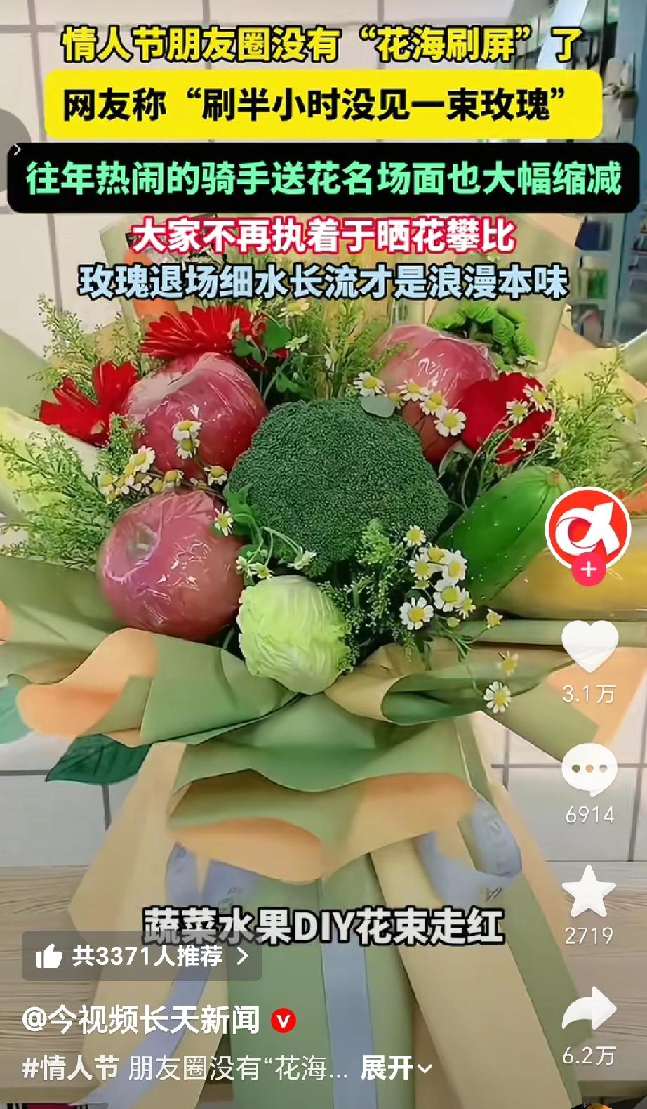 今年2月14号情人节朋友圈确实没有出现往年的“花海刷屏”现象,也许原因是现在的年轻人开始告别消费主义绑架,拒绝为天价浪漫买单,平价浪漫成为主流:天价花束少有人问津,几十元的手工花束、自制心意取代了高价礼盒,同时大家更注重陪伴、悦己等情感本身的表达,而非通过晒花进行攀比,也让情人节的庆祝方式变得更多元,爱自己、爱身边人成为新的浪漫准则。(来源于@今视频长天新闻)