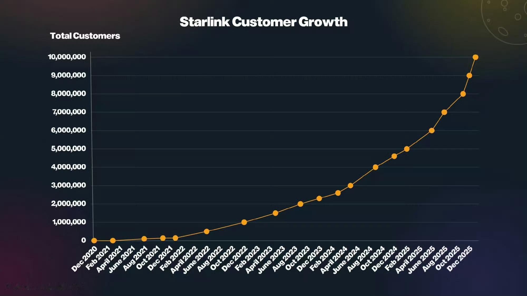 【星链用户数正式达到1000万】航天商业航天 美国太空探索技术公司(SpaceX)于2026年2月14日正式宣布,其星链(Starlink)卫星互联网服务的全球活跃用户数量已突破1000万大关,覆盖国家和地区达到160个,且用户增长仍在加速