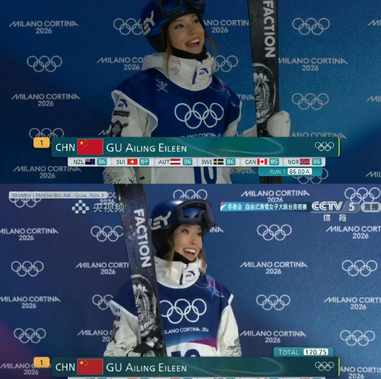 中国队冲击首金的压力又给到谷爱凌!谷爱凌4年来第一次跳大跳台,实力真的是太强了,也就是说北京冬奥会夺冠后,谷爱凌就没参加过大跳台的比赛,米兰冬奥会是4年来首次比,归来依旧是王者,第一跳86分,第二跳84.75分,总得分170.75分排名第二,晋级决赛!中国队小将刘梦婷排名第9,同样晋级决赛!
