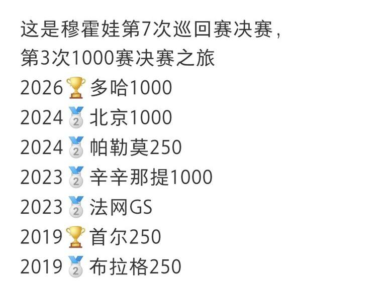 穆霍娃职业生涯7次闯进巡回赛决赛,第二次夺得冠军,上一次夺得冠军还是在2019年,还是级别最低的250赛事冠军。 正所谓时也命也运也,火娃总算拿到高级别巡回赛的冠军了。好多有实力的球员穷其职业生涯都拿不到一个1000赛的冠军,更不要说大满贯冠军了。 也希望我们中国的金花王欣瑜早日拿到巡回赛首冠,郑钦文早日拿到首个1000赛冠军甚至大满贯冠军,以不负韶华!!!