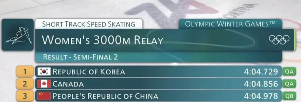 2月15日,冬奥会短道速滑女子3000米接力半决赛中国队派出张楚桐、公俐、杨婧茹、王欣然四人出战。 中国队在第二组最后5圈抓住机会抢到首位,但在倒数第3圈被韩国超越,最后半圈被加拿大硬吃,遗憾排名小组第三,无缘A组决赛。胜利明明就在眼前,可是又从身边溜走,实在是太痛了! 还剩6圈左右杨婧茹超越到第一, 还剩3圈左右张楚桐被崔敏静超越, 还剩1圈左右公俐被加拿大超越。 纵观今天女队3000米接力整体发挥还是很好的,尤其杨静茹那棒超越,从第三名超越到第一。但还是硬实力不足,特别是公俐在最后一个弯道冲刺时被硬吃。年轻不是理由,那些前辈们也都是年轻时候出成绩的。 从2018平昌冬奥会女队新世纪以来首次无缘金牌,2022北京冬奥会女队首次无缘个人奖牌,再到2026米兰冬奥会女队接力无缘决赛,三届冬奥会,短道速滑女队一届比一届差!不断刷新短道速滑女队的新低。 韩国、加拿大、荷兰和意大利将争夺冠军。