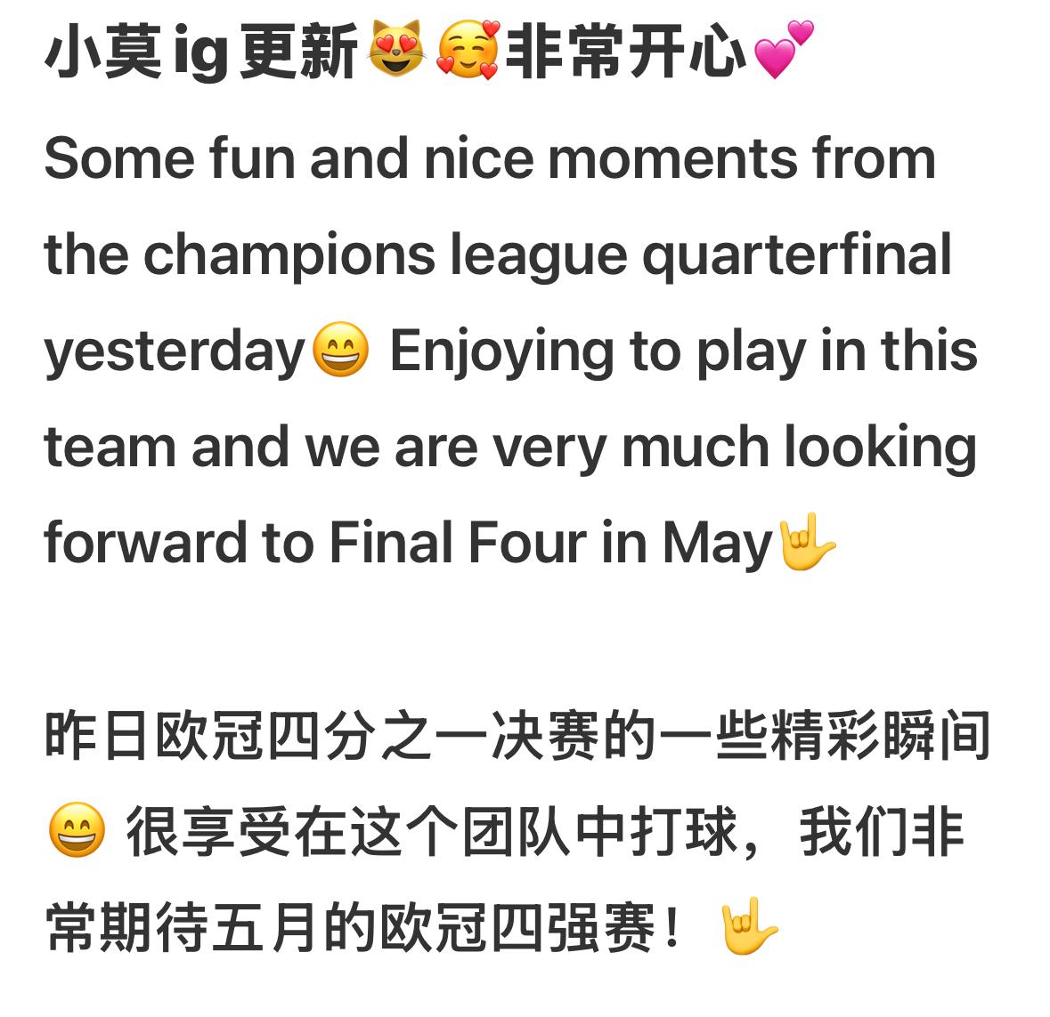 莫雷加德更新:非常开心😃! 昨天欧冠1/4决赛的 一些精彩瞬间[大笑], 非常