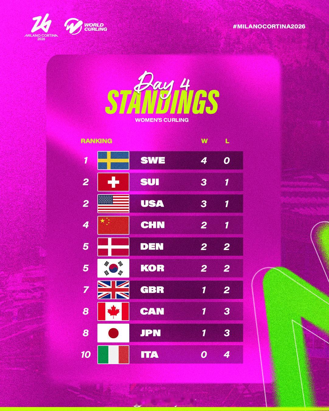 米兰冬奥会冰壶团体比赛第四比赛日后积分榜排名