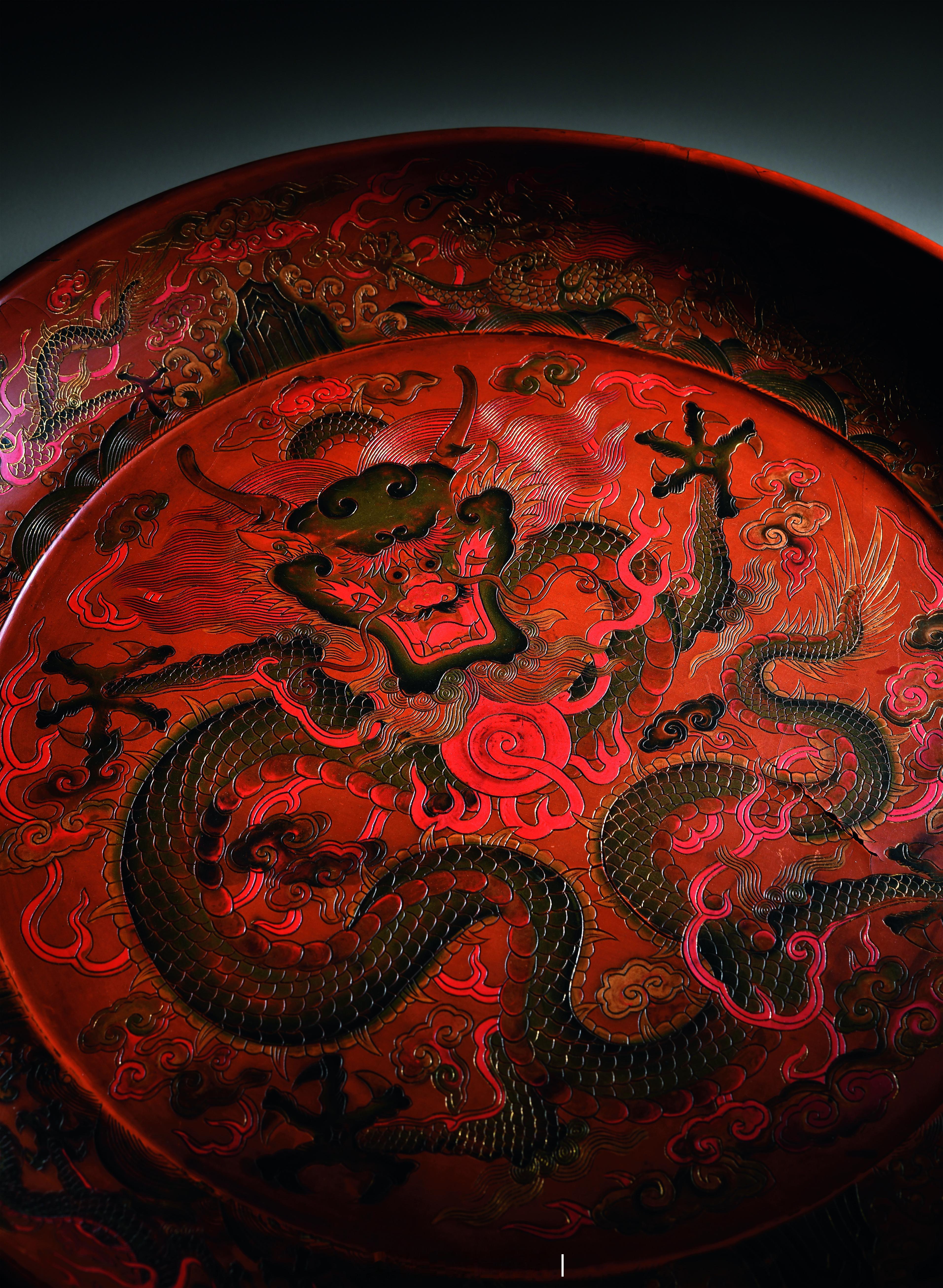 器作浅盘式,木胎,通体髹饰朱红大漆,复经剔刻描金而成,大敞口,薄唇内弧壁,下承直壁浅圈足。则内盘底髹饰朱红色大漆。除此之外,均髹饰以龙纹。其中,盘底中央以朱红为地,绘饰正面腾龙形象,其双角两分,高额瞠目,高鼻阔口,獠牙外露,张牙舞爪,一副凶悍威风的模样,余地以朱红等五彩勾绘会火焰纹、祥云纹等。盘之弧壁则以五彩勾绘四条行龙,呈首尾追逐状,四龙之间勾绘福山寿海。余地以五彩勾绘火焰纹祥云纹等。盘之外壁,则以五彩勾绘牡丹等花卉,富丽堂皇。圈足外壁以金漆剔饰回纹一周。盘底中央剔刻“宣德”楷书二字。《髹饰录》评价雕漆有云:“宋元之制,藏锋清楚,隐起圆润,纤细精巧。”至明代,漆饰工艺手法更趋多样。此件朱漆彩绘龙纹大盘以龙为饰,首先可见出身显贵,不同凡响。其次,以五彩勾绘渲染也堪称一绝,渲染手法多样,使得画面层次更为丰富,主题突出鲜明。是明代朱漆彩绘典型作品