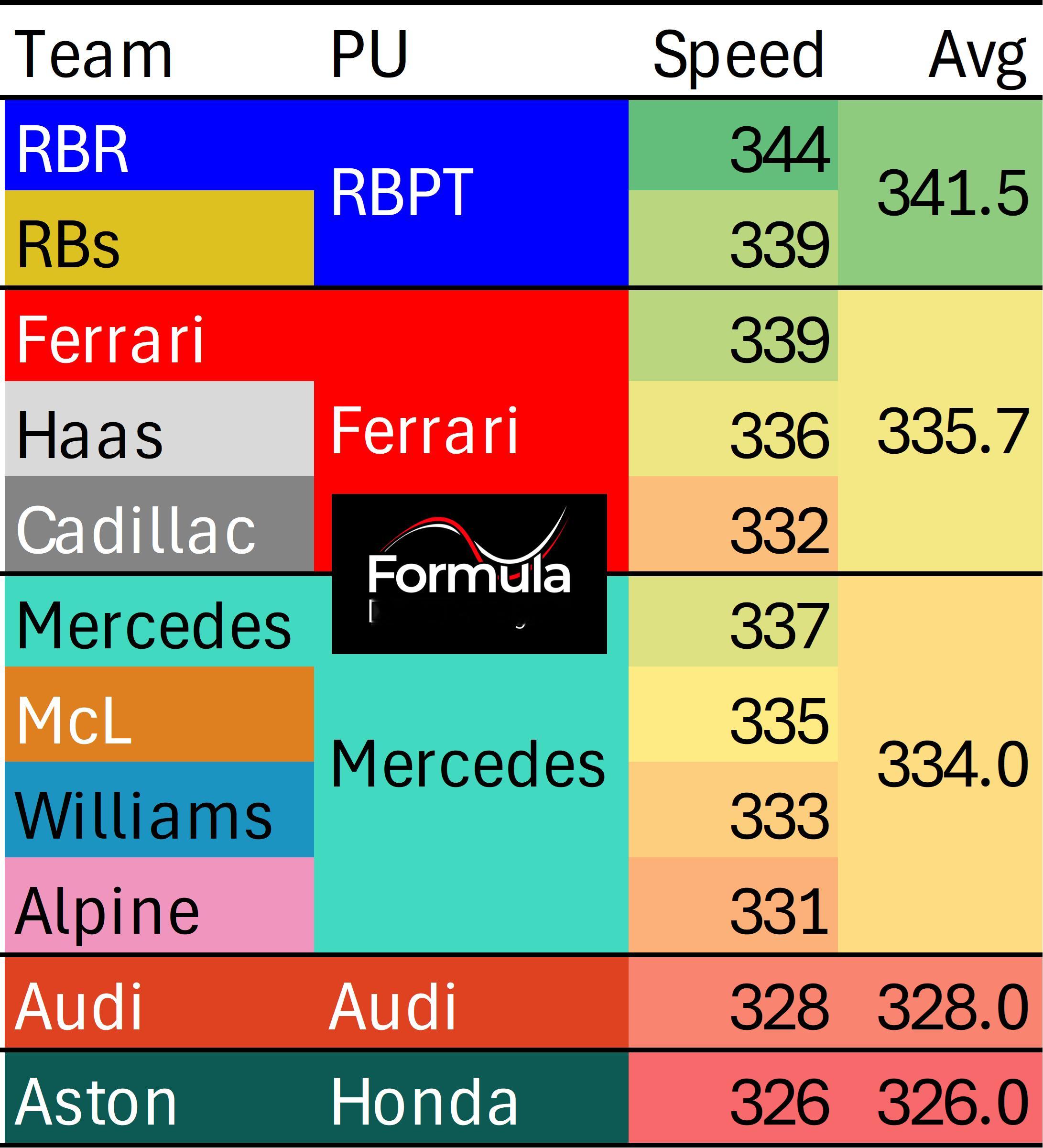 巴林第一轮季前测试各支车队尾速情况,最快来自于红牛,344km/h是维斯塔潘在第1天所做出的;奥迪和本田性能上有一定差距。