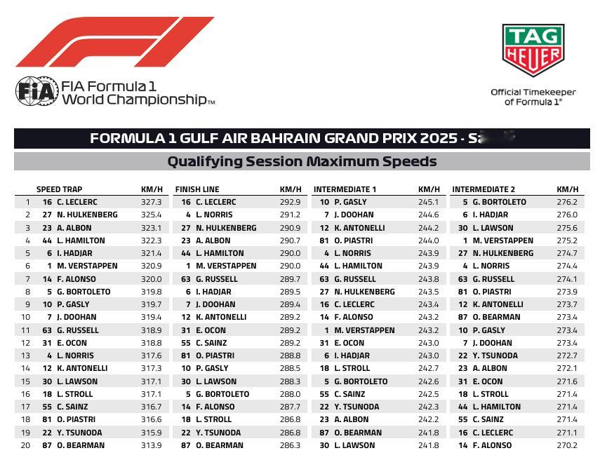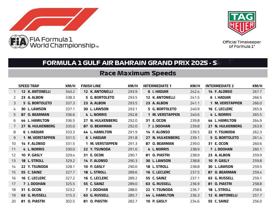 26巴林测试:344km/h(维斯塔潘)25巴林正赛:340.2km/h(安东内利)25巴林排位:327.3km/h(勒克莱尔)