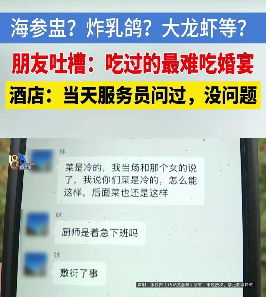 太糟心了!浙江金华,女子特意选了一家高档酒店办婚礼,一共摆了11桌婚宴,每桌3988元,海鲜、鸡鸭鱼肉俱全,相当丰富。本以为亲朋好友都能吃的满意,谁知婚宴结束后,很多亲戚给她反馈,说菜品太凉,质量太差,是他们吃过最差的宴席。女子面子上瞬间挂不住了,赶紧找到酒店要个说法,谁知,酒店的态度让她更是气不打一处来。 去年12月份,黄女士要举办婚礼,这可是她人生中的一件大事,为了办得圆满体面,她特意考察了好多家酒店。 最终,因为场地原因,她选择了其中一家相对比较高档的。 12月13日,她在这家酒店办了婚礼,婚宴一共摆了11桌,每桌20道菜,每桌的价格是3988元。 除了场地,菜品也相当重要,这是亲朋好友们最期待也最看中的。 婚礼前,黄女士专门过来跟主厨沟通过,提了三点要求:第一,因为是冬天,希望菜端上来都是热气腾腾的;第二,食材要新鲜;第三,不敢要求多好吃,毕竟众口难调,但至少大家吃了之后,起码不能说不行。 当时主厨都答应了,她心里还挺踏实,觉得这下应该稳了。 酒店那边建议她先试菜,但试菜要自己付费,黄女士想了想,一桌菜都快4000了,真不便宜,再额外掏钱试菜,总觉得有点多余。 再说这么大一个酒店品牌,应该不会差到哪里去,所以她决定不试了,相信酒店。 按照酒店提供的菜单,一桌的菜色有:海参、炸乳鸽、大龙虾、扇贝蒸青蟹、老鸭煲、青斑鱼、牛仔骨等等,海鲜、鸡鸭鱼肉俱全。 黄女士想着,这么丰盛的菜,宾客们肯定能吃得满意。 可婚礼结束之后,黄女士收到的反馈却让她懵了,很多亲戚朋友,包括她妈妈,都跑来跟她说菜的问题。 有人说牛肉是硬的,咬都咬不动,还有人说很多菜品都是凉的,尤其是那个波士顿大龙虾,还有人说龙虾非常小,根本就是拿丸子凑数。 妹妹表示,自己在婚礼中途就跟工作人员反映过菜不热,但后面也没见改善。 更让黄女士难堪的是,有朋友直接评价说,这是吃过最难吃的宴席,色香味全无。 黄女士一听脸上瞬间挂不住了,自己花了这么多钱,怎么搞成这样? 黄女士很生气,找到酒店经理,想沟通一下这事儿,结果经理一句话没说,转身就走。 她站在那儿愣了半天,心里更堵得慌:这么大酒店,出了事连个说话的人都没有? 她又联系了餐饮部的总监,总监的解释是:菜的温度大概在五十到六十度之间,至于什么叫热、什么叫不热,这属于个人感觉。 他还说,当天有专职服务员在现场问过,没发现问题,对于龙虾肉少之类的质疑,他们可以出示采购证明。 总监还反问黄女士:如果有问题,你当时为什么要签字? 说到签字这事儿,黄女士也挺委屈的,她说当时刷卡付钱,对方根本没跟她说清楚签字意味着什么。 自己是出于对你们酒店的信任才签字的,又不是因为认可酒店的菜有多好。 她还强调,当时根本没人每桌来问菜品怎么样,不存在什么意见反馈,她怀疑,自己被坑了。 另外,黄女士还表示,最早确认订单之前,主厨当面承诺过,婚宴是由他本人来掌勺的,结果实际并不是这样。 她后来追问才知道,只有几个大菜是主厨烧的,其他都不是,这不是骗人吗?她当初就是冲着主厨的手艺才定这家的。 对此,主厨说,自己做了二十多年厨师,从来没说过婚宴的菜都是他一个人烧,他都在现场管控。 对于黄女士的投诉,他觉得有点不讲道理,建议她找酒店,别找自己。 在黄女士看来,这些菜品是婚礼当天最大的败笔,她希望酒店能退还他5000块钱。 本来觉得这个要求并不过分,毕竟宾客吃了顿冷饭冷菜,面子里子都丢光了,一辈子一次的婚礼也被毁了。 但餐饮总监的态度很明确,如果每个人去吃了觉得不好吃就要赔偿,那酒店做不到,毕竟众口难调,他们只愿意赔偿2000块钱的酒店代金券。 对于这个赔偿方案,黄女士完全接受不了,毕竟这一次体验感如此差,他以后坚决不会再来这家酒店消费了。 《民法典》第584条规定:当事人一方不履行合同义务或者履行合同义务不符合约定,造成对方损失的,损失赔偿额应当相当于因违约所造成的损失。 酒店未按约定提供热气腾腾、食材新鲜、主厨掌勺的婚宴服务,菜品凉、食材不符、口感差,已构成履行合同不符合约定。 黄女士因婚礼体验受损、名誉与精神层面遭受不利影响,有权主张相应损失赔偿。 酒店以签字、众口难调推卸责任不成立,其未兑现口头与书面服务承诺,且服务存在明显瑕疵,应承担违约责任。 目前,双方还在进一步协商中,若协商不成,黄女士可以用过法律途径解决。 不得不说,酒店的态度真是差,全程都在推卸责任。 黄女士太大意了,毕竟现在好多酒店很多都是预制菜,你不试菜,不坑你坑谁。