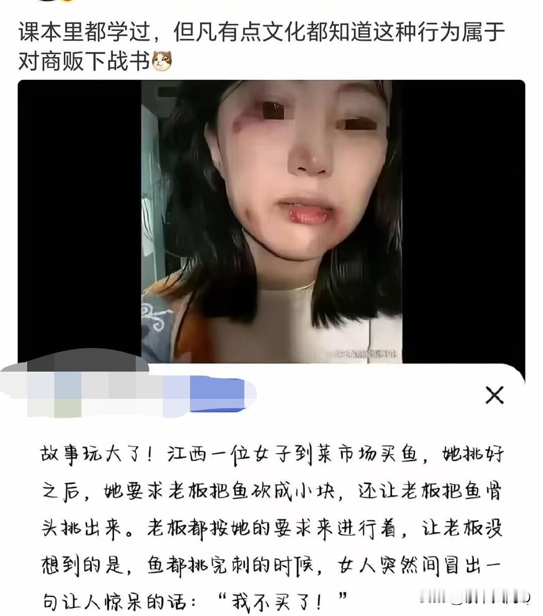 只看文字的时候,我一直觉得这个女的一定是体校练散打的,要不就是男朋友是鲁智深那样的,直到看到了图片才明白她只是一个无知的小仙女而已! 但凡有点文化,就知道半斤肥,半斤瘦,细细的切做臊子后果是很严重的! 你说她会不会真的是还鲁智深转世,没明白自己已经是女儿身,这一顿揍后彻底清楚了![得意]