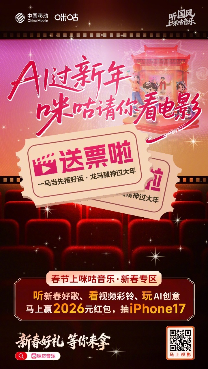 🎬#AI过新年咪咕请你看电影# 2026马年新春福利:✅ 送春节档热门电影票,一马当先接住好运 ✅ 参与活动互动赢取2026元现金红包和iPhone17大奖!👉 上咪咕音乐新春专区:玩AI创意、听新年好歌、看视频彩铃,一站式解锁新春快乐!🐎#灵犀智拜年马上AI尝鲜##听国风上咪咕音乐##AI中国年国风贺新春# 🔗网页链接