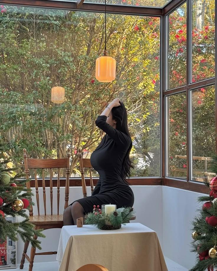 冬日的暖阳,悄然渗入玻璃花房, 红梅绽放如诗,绿叶低语成曲。 她着一袭墨色长裙,紧贴肌肤的柔软, 勾勒出时光最温柔的曲线。 长发如夜瀑倾泻,轻抬纤手掠过发梢, 那一眼,似含露的玫瑰,羞涩却撩拨心弦。 黑丝缠绕玉腿,慵懒倚在古木摇椅上, 烛光摇曳,圣诞饰球轻吻空气中的松香。 她微微侧首,唇边绽开一抹浅笑, 仿佛在耳畔呢喃: “来吧,走进这光影交织的梦里, 与我共醉这静谧又炽热的瞬间。” 谁能逃脱这样的温柔囚笼呢? 心,已在花影中沦陷红梅雪景照 红梅雪景写真 雪中红梅照 红梅古风照