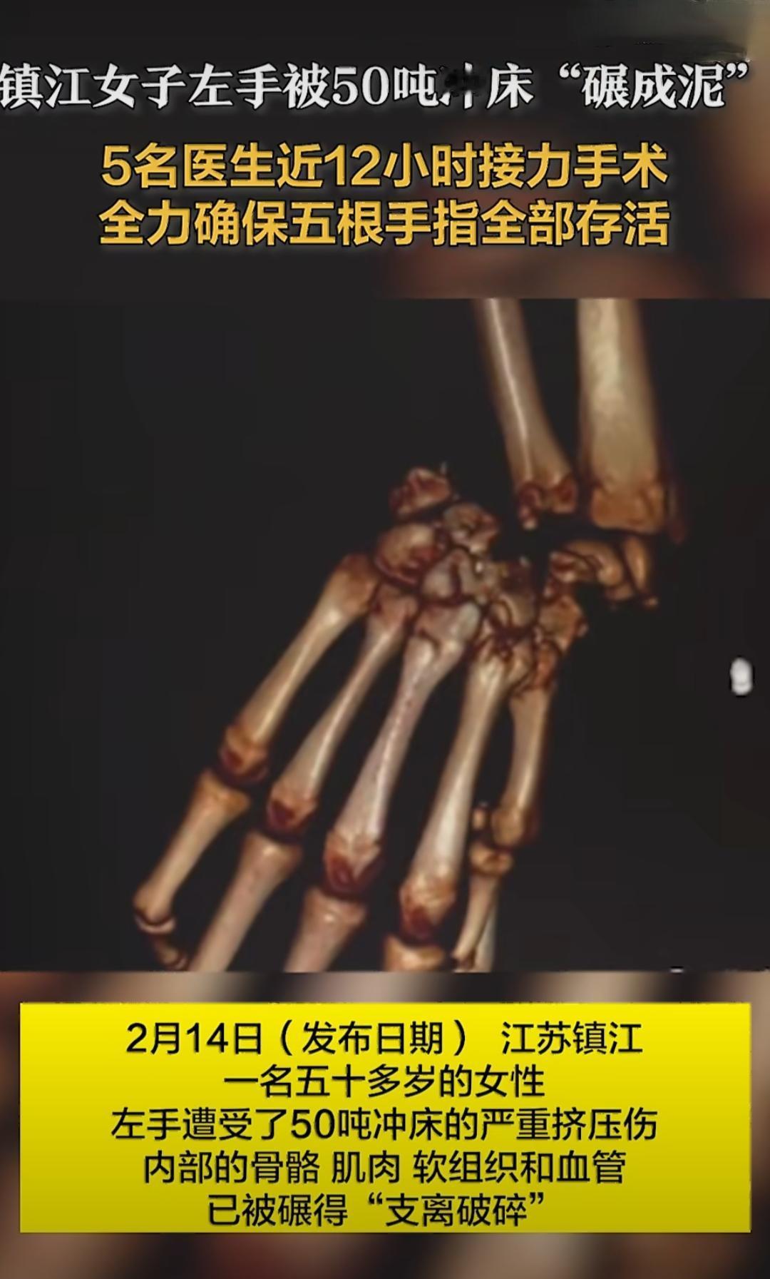春节前夕,镇江一名五十多岁的女性遭遇了一场可怕的工伤,左手被50吨的冲床狠狠挤压,整只手掌被碾得面目全非,紧急送医后,医生们历经12小时的接力抢救,硬是从“绝境”中保住了她被碾成泥的左手,这台超高难度的手术也让不少人感叹医护人员的精湛医术。事发时,这位女患者在操作冲床的过程中意外受伤,50吨的巨大压力瞬间作用在左手上,带来了毁灭性的损伤,被送到镇江市第一人民医院时,她的左手已经严重毁损变形,皮肤破开的地方能清晰看到粉碎的骨骼碎片,里面的骨头、肌肉、软组织还有细细的血管,全都被碾得支离破碎,惨不忍睹,这样的伤情,别说保住手掌,就连简单的止血和处理都十分棘手。 面对这台几乎是“不可能完成”的手术,医院的医生们没有放弃,经过快速会诊后,毅然确立了保肢的治疗目标,他们知道,手对于普通人的生活和工作有多重要,哪怕只有一丝希望,也要拼尽全力。随后,一场与时间赛跑的抢救正式开始,医生们在高倍显微镜下展开了“毫米级”的精细攻坚,这台手术的难度超乎想象,被碾毁的手部血管细如发丝,且破损严重,要将这些破碎的血管重新连接,还要进行血管移植和吻合,每一个动作都需要极致的精准和耐心,哪怕手稍微抖一下,都可能让之前的努力前功尽弃。 参与手术的医生们轮流上阵,接力操作,全神贯注地处理着手部的每一处损伤,修复骨骼、拼接肌肉、移植血管、吻合神经,一步一步有条不紊,原本预计的数小时手术,因为伤情过于复杂,硬生生持续了近12小时,手术室里的医护人员们顾不得休息,靠着专业的技术和坚定的信念,坚持完成了每一个操作步骤。功夫不负有心人,经过12小时的不懈努力,这台超高难度的保肢手术终于取得了成功,医生们不仅保住了患者的左手,还最大限度地保留了手部的功能,让这只被碾成泥的手掌重新有了生机。 术后经过精心护理,患者再植的手指全部顺利存活,目前正处于康复治疗阶段,虽然后续还需要漫长的恢复训练,才能慢慢恢复手部的活动能力,但能保住手掌,已经是不幸中的万幸。这场12小时的接力抢救,不仅展现了现代医学的进步,更让我们看到了医护人员面对疑难伤情时,不抛弃、不放弃的职业担当,也让人们感受到了生命背后,那些默默守护的温暖与力量。