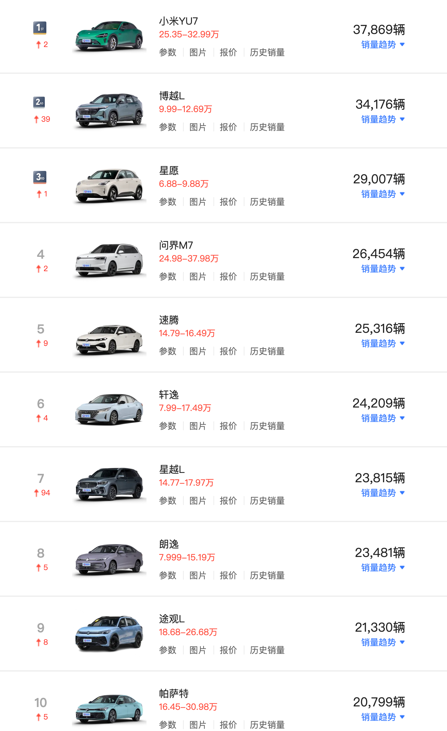 1月最畅销车型榜单,YU7第一。