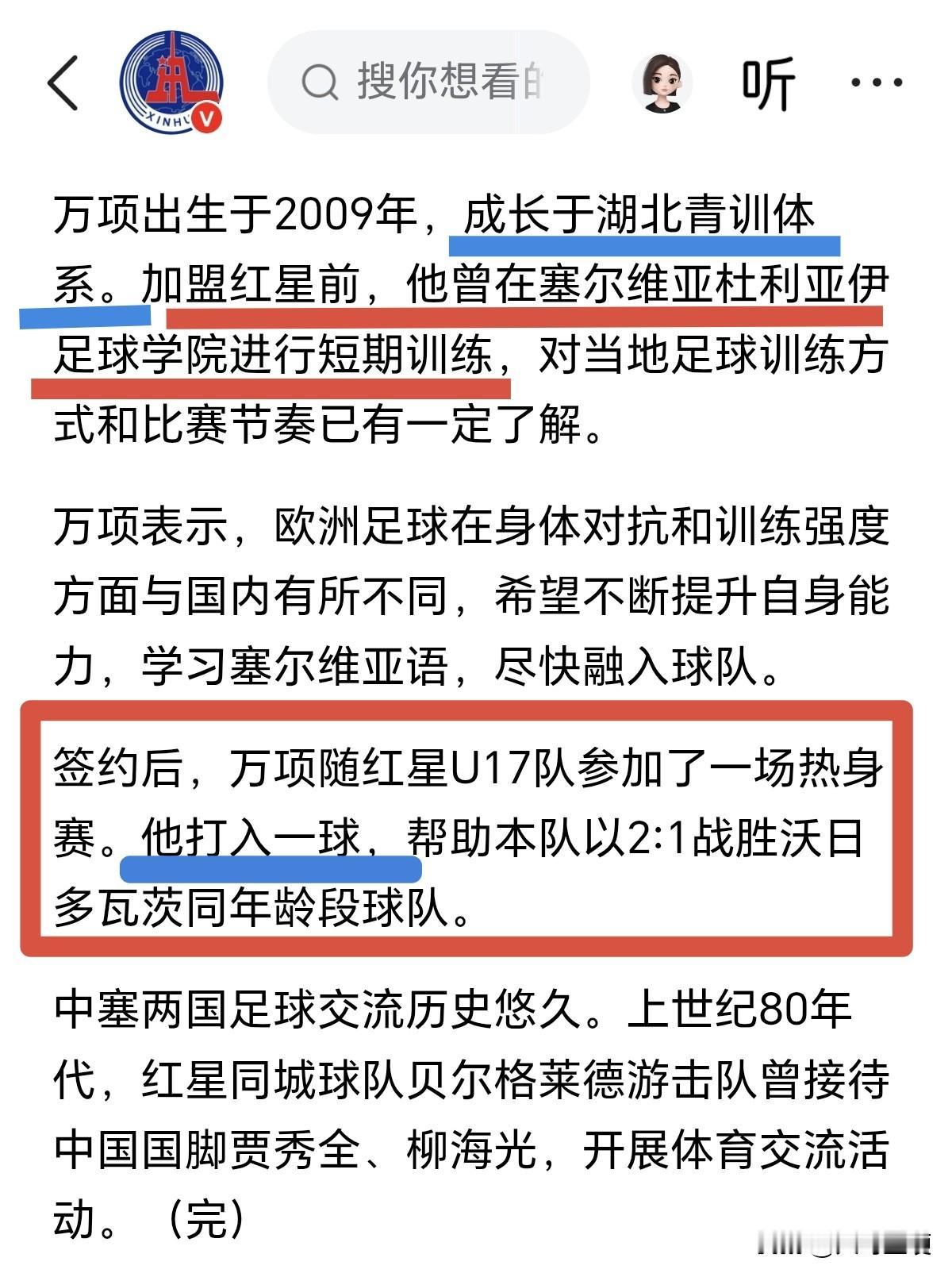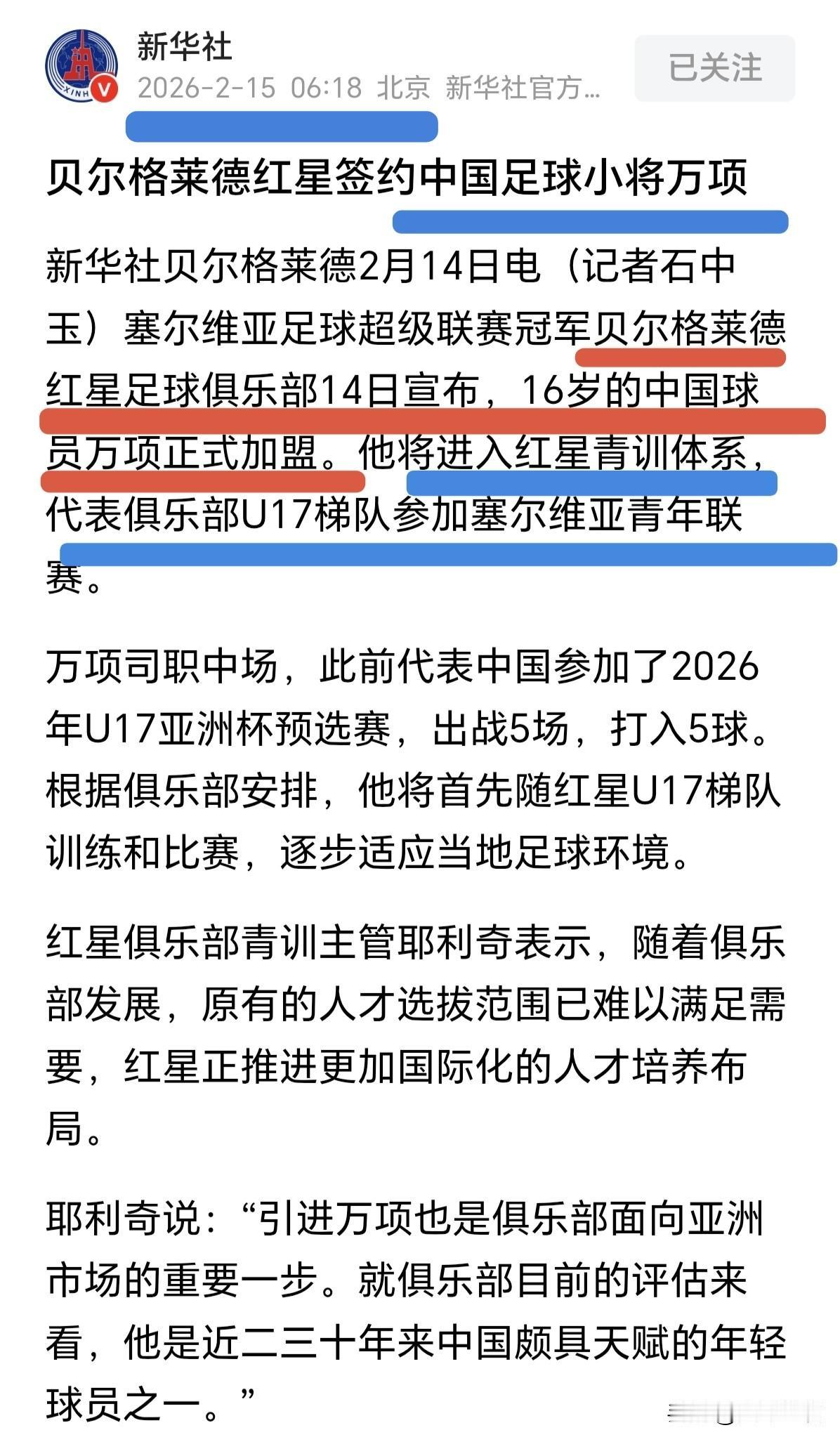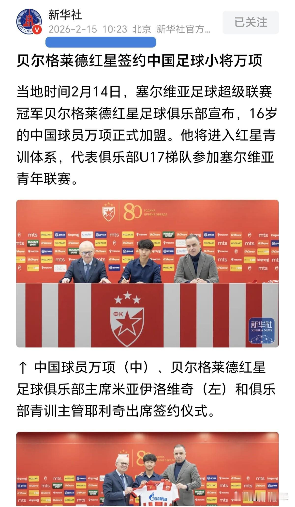 4小时零5分!新华社连发两篇报道,关于万项加盟贝尔格莱德红星[赞] 北京时间2月15上午,新华社在4小时零5分之内连发两篇报道,介绍16岁的中国小球员万项,加盟塞超贝尔格莱德红星俱乐部,这在以往关于国内年轻球员的报道中,是极其罕见的[赞] 虽然报道标题中出现“中国足球小将”字样,但报道的全文对于万项的受训经历,只提到湖北星辉。这足以可见,“中国足球小将”这六个字,是对中国年轻小球员的统称,而不是特指某一个所谓的球队[嘘] 类似的表述,在山东泰山U17队(中国犀旺队)远赴法甲欧塞尔俱乐部的报道中,也曾经使用“中国足球小将”字样[加油] 至此,万项也成为继姜景祺之后,第二位离开所谓的“中国足球小将”,登上新华社报道的09年龄段的小球员,未来还是相当值得期待的[赞] 客观而言,关于万项的这两篇报道,可以说是中国球迷收到的最好的新年礼物,恭喜万项,恭喜中国足球[击掌]