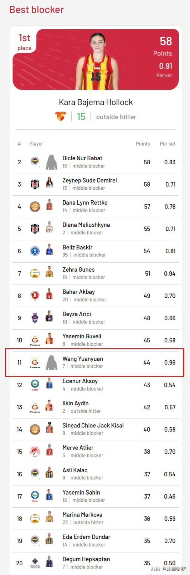 2025-2026赛季土耳其🇹🇷女排联赛常规赛第二十二轮,加拉塔萨雷3-2土耳其航空(23-25 25-22 16-25 25-19 15-12),取得第十五场胜利。 单场5拦助加拉塔萨雷险胜土耳其航空,保留冲击四强希望。王媛媛个人拦网排名逼近前10,与队内拦网最高者娅塞明.居维里只有1分之差,杀入前10不是梦,局均拦网仍稳局首位。继续加油!