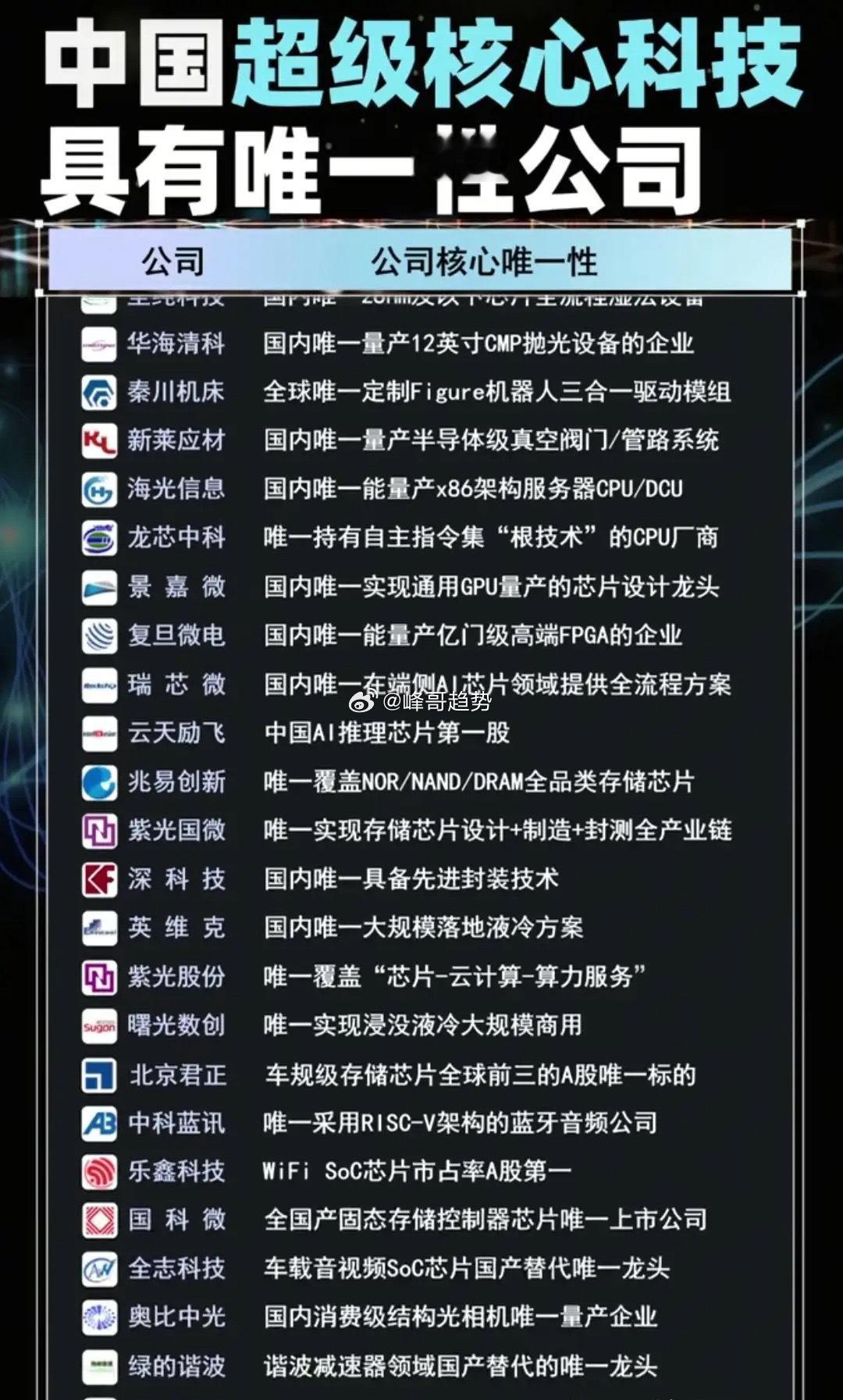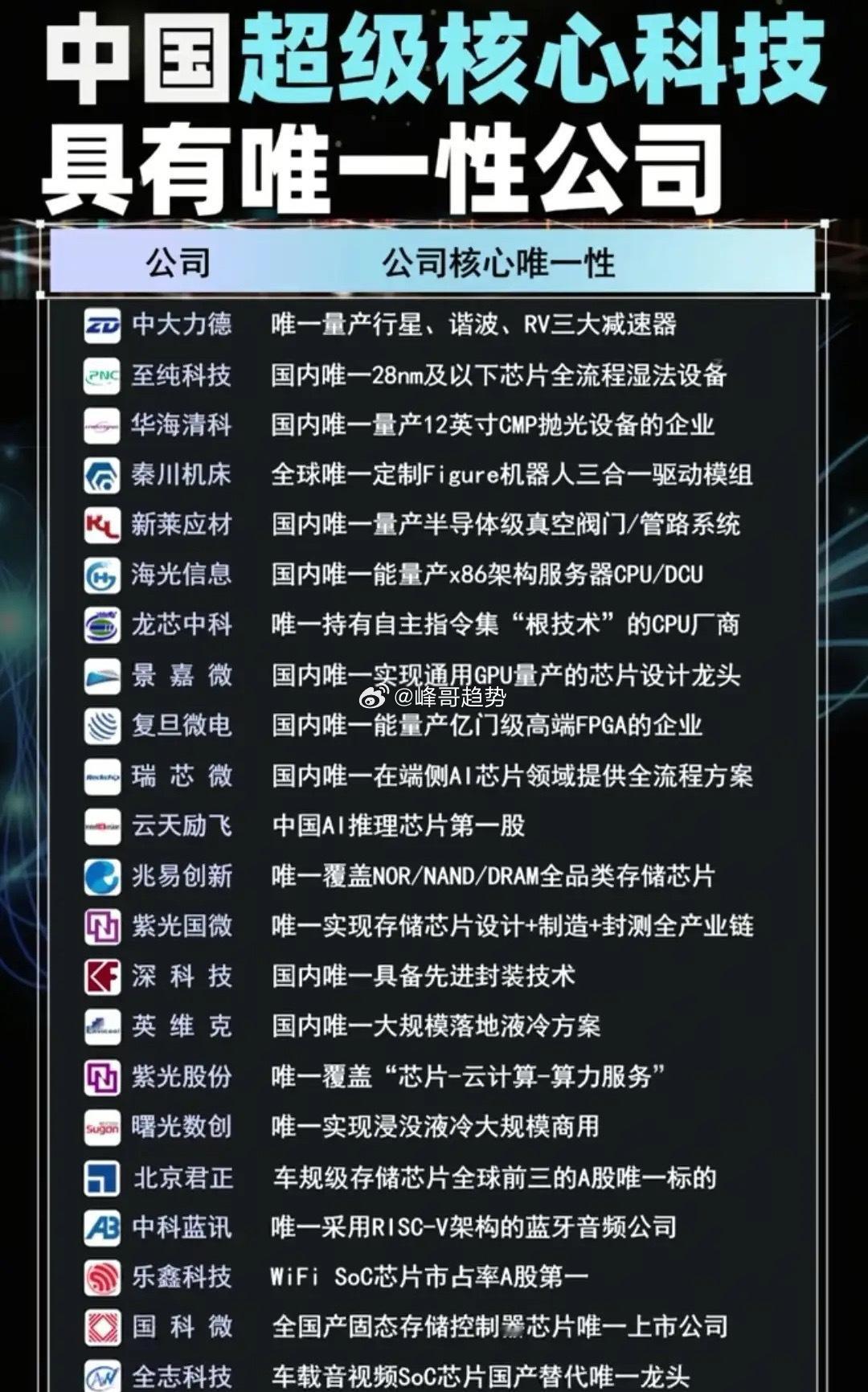 中国科技“唯一”护城河!这些公司垄断核心赛道,A股硬核资产全在这,重磅分享值得收藏!打破技术封锁!中国超级核心科技领域,这些公司手握“唯一”壁垒,从芯片、算力到机器人,每一家都是国产替代的绝对龙头!从28nm湿法设备到x86服务器CPU,从通用GPU量产到机器人全套技术,每一项“唯一”都是中国科技自主可控的底气!