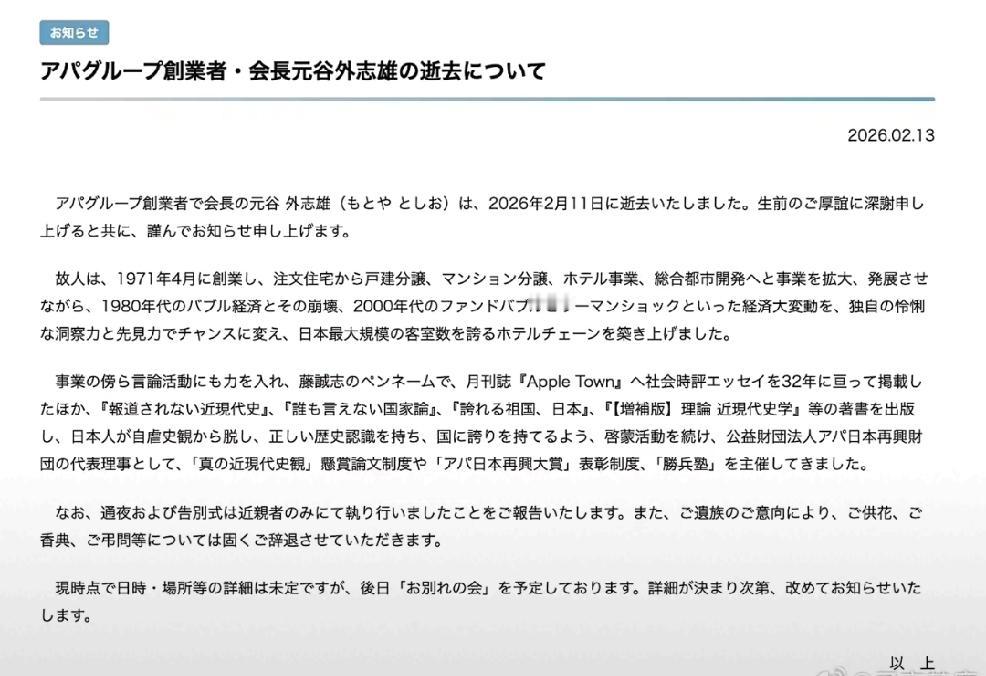 近日,日本死硬派老右翼分子,ApA酒店创始人元谷外志雄死亡,终年82岁。 此人常年为日本侵华罪行诡辩逃脱,胡言乱语包括但不限于以下: 南京大屠杀是捏造的谎言,是中国军队自己干的。 日军强征慰安妇是美国为了把核爆日本的罪孽合法化而捏造的,她们都是自愿向日军出卖自己的。 此人一贯是高市早苗的铁杆忠诚者。 日本右翼分子称之为“巨星陨落” 个人认为:为何让这样一个弥天大谎,罪孽深重,死不悔改,死不足惜的日本军国主义分子得享82年阳寿? 希望这条信息能够在中文网络广为传播。 让这位“日本巨星”遗臭万年,永远刻在历史耻辱柱上,永世不能翻身。