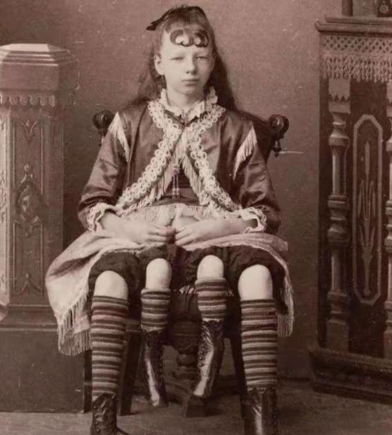 上世纪60年代,美国一个长着四条腿和两个生殖器官的女孩,被父亲高价卖给马戏团,女孩不仅被当做怪物围观,竟然还被当众要求脱裤子验证四条腿的真假。 莫特尔·科尔宾,1868年出生在美国田纳西州林肯镇,她一出生,就和普通孩子不一样。 她长着四条腿,还有两个生殖器官,官方说法是双臀畸形,说白了就是腰部以下,有两个独立的骨盆,多余的两条腿,本来是属于她没正常分离的双胞胎姐妹的。 那两条多余的腿,比正常的腿小,还很虚弱,没法用来走路,顶多能轻微移动。 莫特尔的父亲,没想着好好照顾这个特殊的女儿,他眼里只有钱,在莫特尔还小的时候,她父亲就把她高价卖给了马戏团。 从此,马戏团把她当成噱头,四处宣传,说有个长着四条腿的女孩,吸引了很多人来看。 来看她的人,都带着好奇,把她当成怪物围观,有人指指点点,有人窃窃私语,没人把她当成一个正常的人。 更过分的是,马戏团为了证明她的四条腿不是假的,竟然当众要求她脱裤子验证。 莫特尔没有反抗的权利。她被强行要求暴露身体,任由陌生人围观、打量,尊严被踩在脚下。 她每天要面对无数双好奇又冷漠的眼睛,要重复被围观、被验证的流程,没有自由,也没有尊严。 没人关心她疼不疼,没人在意她愿不愿意。在马戏团和围观者眼里,她不是人,只是一个能赚钱的“怪物”。 后来,莫特尔长大了,她没有一直被囚禁在马戏团里,她用自己的两套生殖系统,先后生了五个孩子,四个女儿和一个儿子。 即便后来有了自己的家庭,那段被父亲卖掉、被当众围观的经历,也成了她一辈子的阴影。 她的人生,从一出生就被注定了悲剧。不是因为她的身体,而是因为父亲的贪婪,还有那个把畸形当噱头、把人当工具的时代。 以上部分内容是小编个人看法,如果您也认同,麻烦点赞支持!有更好的见解也欢迎在评论区留言,方便大家一同探讨。