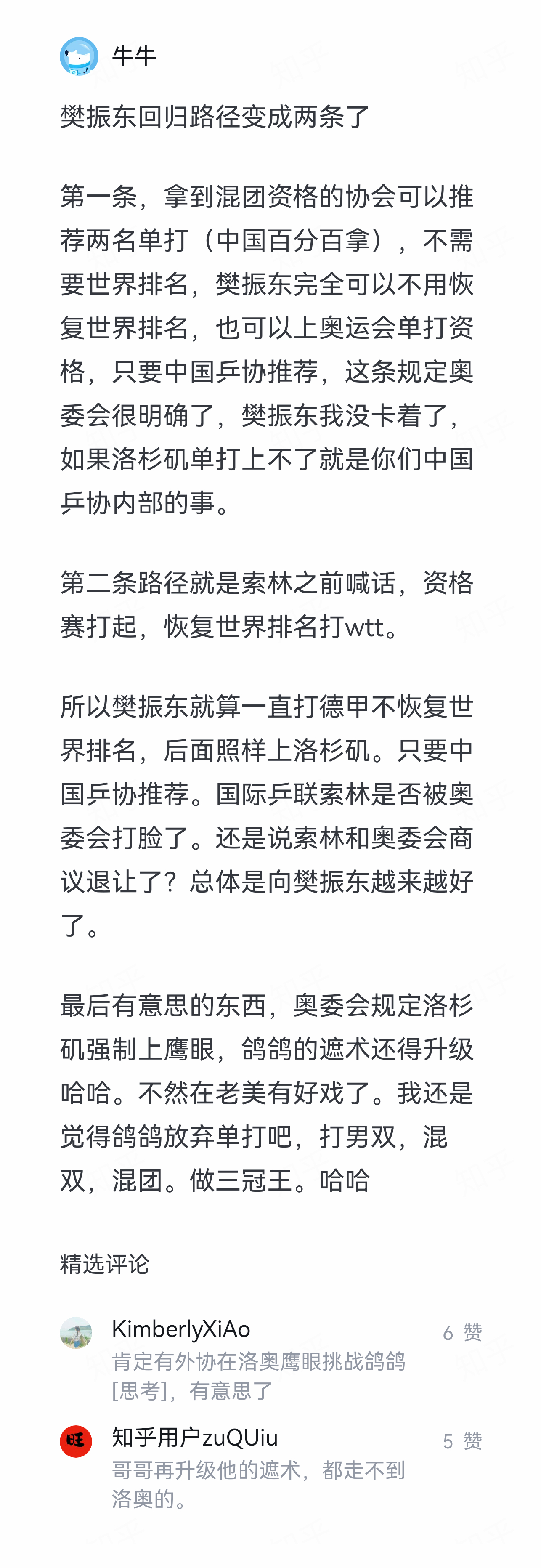 请问如何看待奥委会发布的乒乓球相关规定,其中单打名额不再要求协会内世界排名最高的两位这一内容?