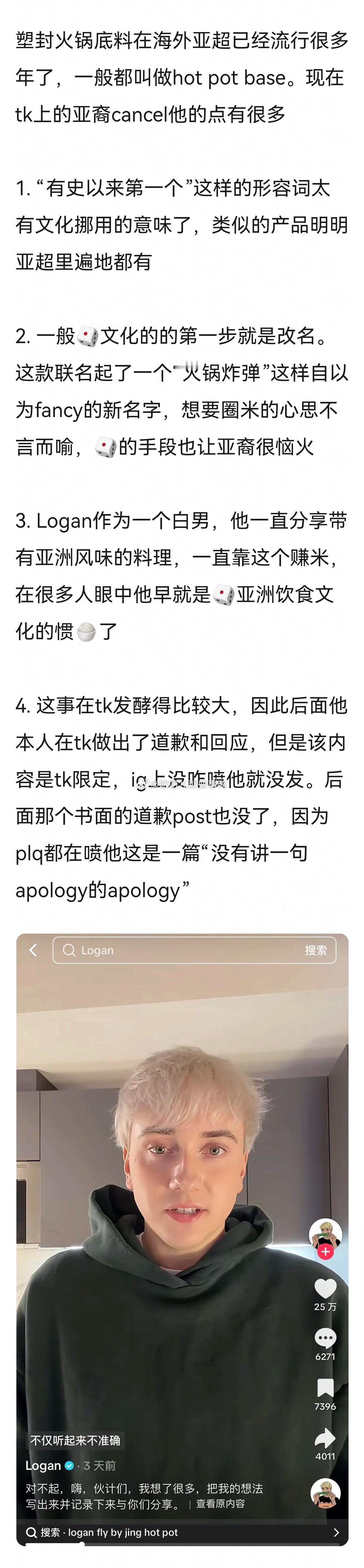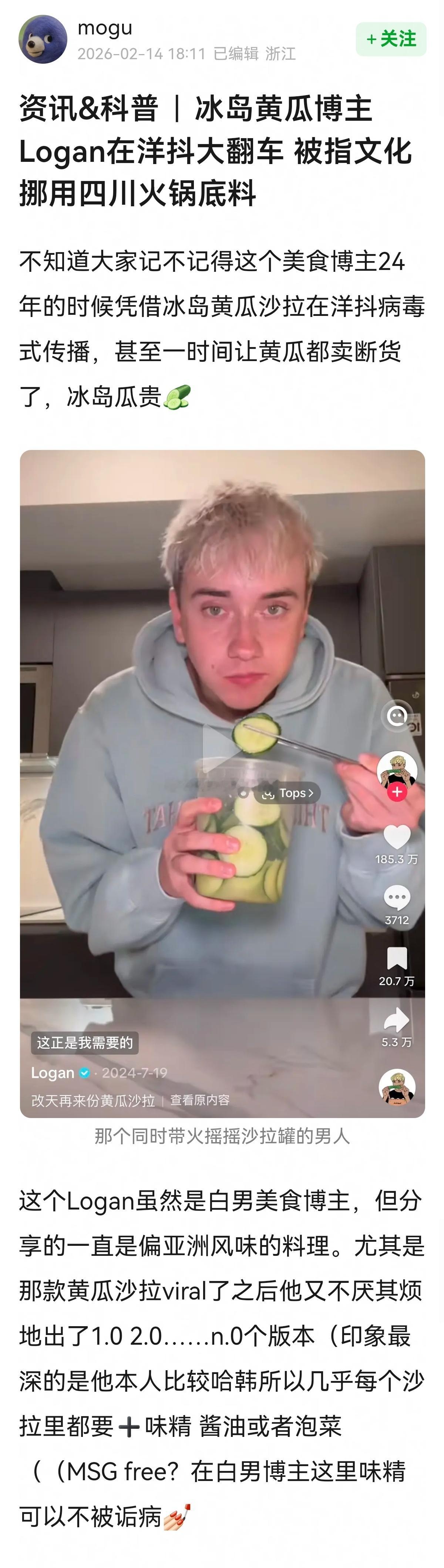 搬→冰岛黄瓜博主Logan在洋抖大翻车,被指文化挪用四川火锅底料~