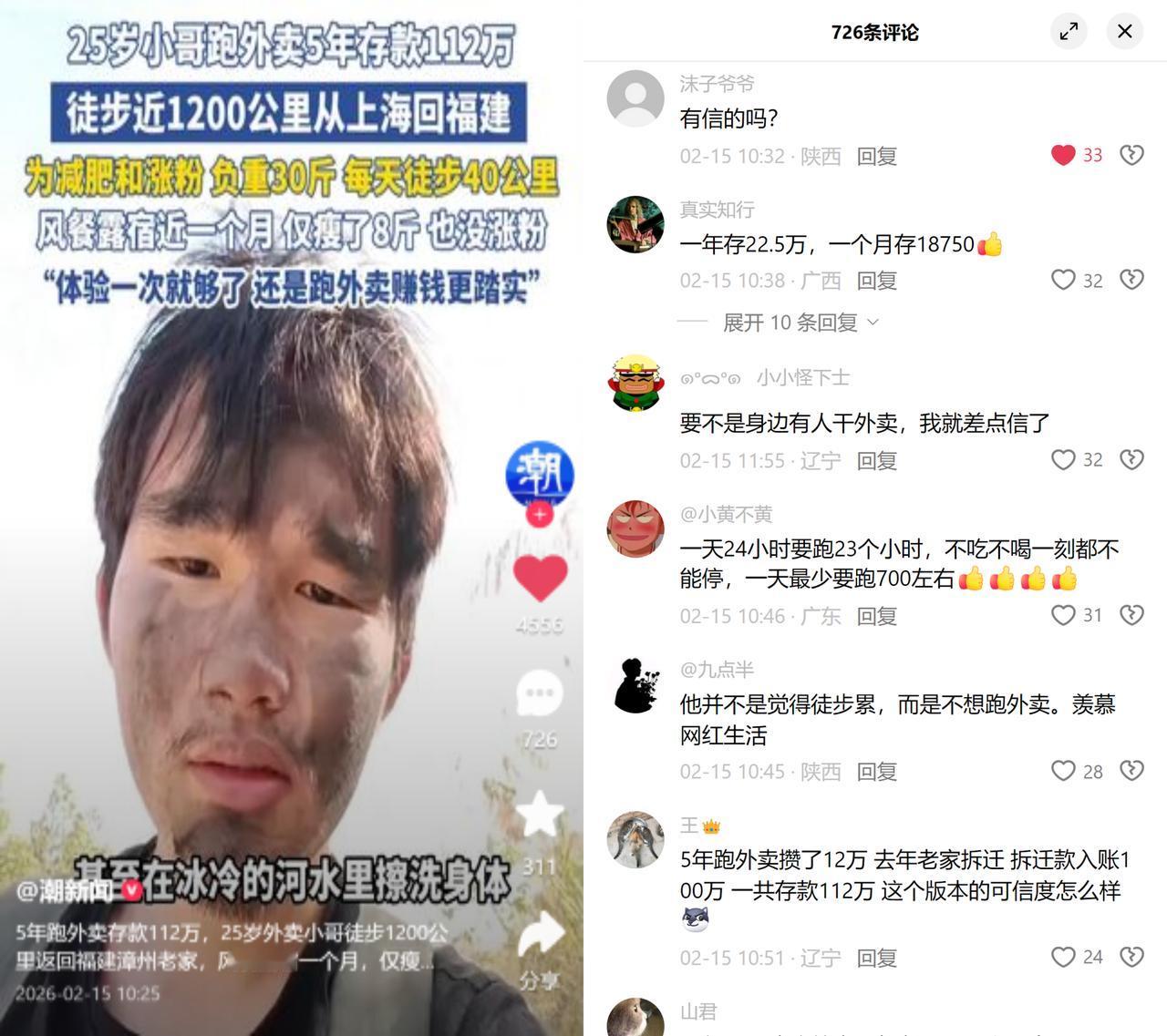 25岁外卖员5年攒112万! 上海外卖员张学强,跑外卖5年纯靠跑单存下112万,日均90-100单,最多一天干180单,5年跑了32万公里。后来想徒步1200公里涨粉转型网红,结果没涨粉还只瘦8斤,坦言还是送外卖踏实。可他的存款数遭全网质疑,有人说造假,有人直指这是用命换钱。 为啥大家不信?还不是因为普通外卖员月入才六七千,他这月存一万八,完全是把自己当机器连轴转啊!一天180单,从早跑到晚,喝水吃饭都得掐点吧?32万公里,绕地球快8圈了! 这未必是行业奇迹,却是外卖行业最扎心的生存真相:单王的高收入,是拿极致的身体透支换的。普通人拼尽全力赚温饱,少数人拿健康换存款,这种劳动价值和身体代价的失衡,想想就无奈,到底是钱重要,还是命重要?