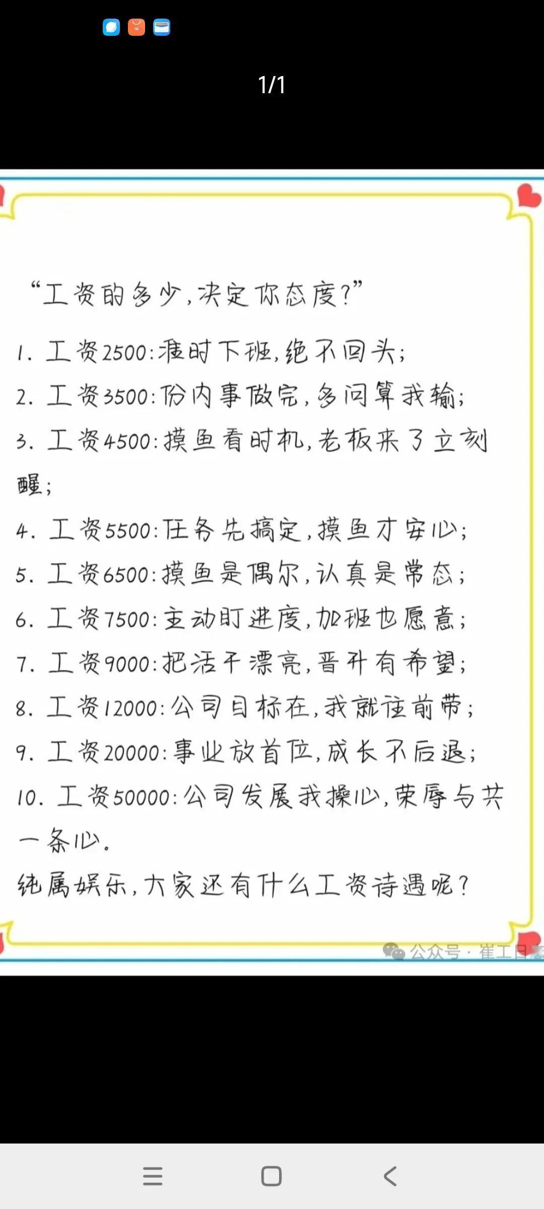 这个是网友总结出来的,工资多少决定工作的敬业度,多一点工资,相应付出也多一点,[捂脸] 一个月薪7500元的员工做事,与一个月薪3500元的员工做事,工作态度完全不同, 一个是积极主动,非常认真,一个只点中规中矩,六十分万岁,[捂脸][捂脸] 我去过胖东来门店购物,人家员工个个笑容满面,热情服务,超出期望值,人家员工薪水有9000元以上,珍惜工作岗位,卖力的工作,与公司共呼吸,共命运,, 去另外一家超市,员工的工资3500元,没啥热情,面无表情,不紧不慢的工作,悄悄的等下班,打卡,立马走人,一分钟也不想停留,,,[捂脸][捂脸][捂脸]