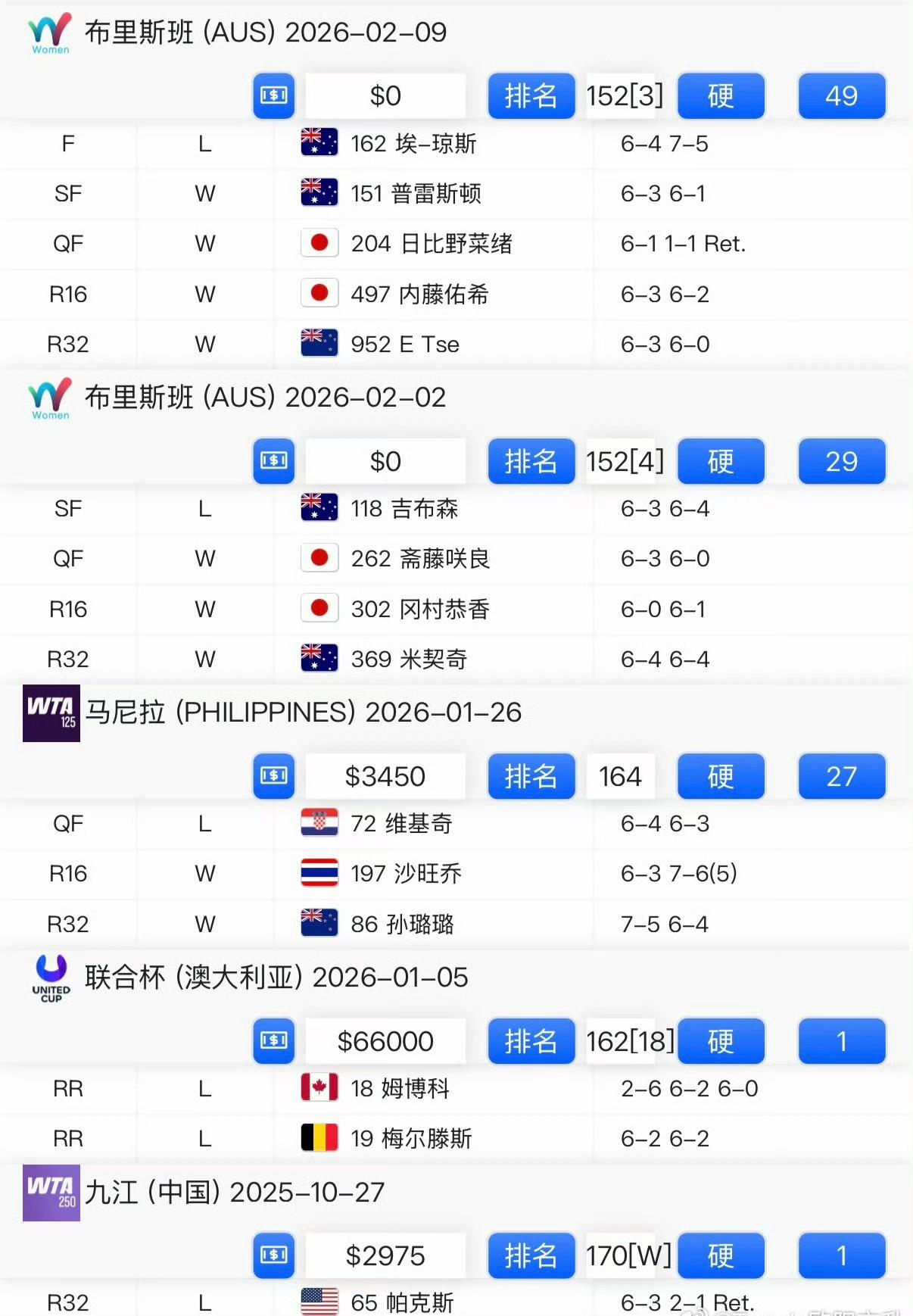 亚运会女单亚军今天拿了亚军,亚运会男单冠军今天拿了冠军。 布里斯班CH75挑战赛决赛,张之臻6-2/6-4博尔特,夺得个人第四个挑战赛冠军。张之臻即时排名319。 布里斯班W75女单决赛,朱琳4-6/5-7琼斯,对手08年出生。朱琳即时排名137。
