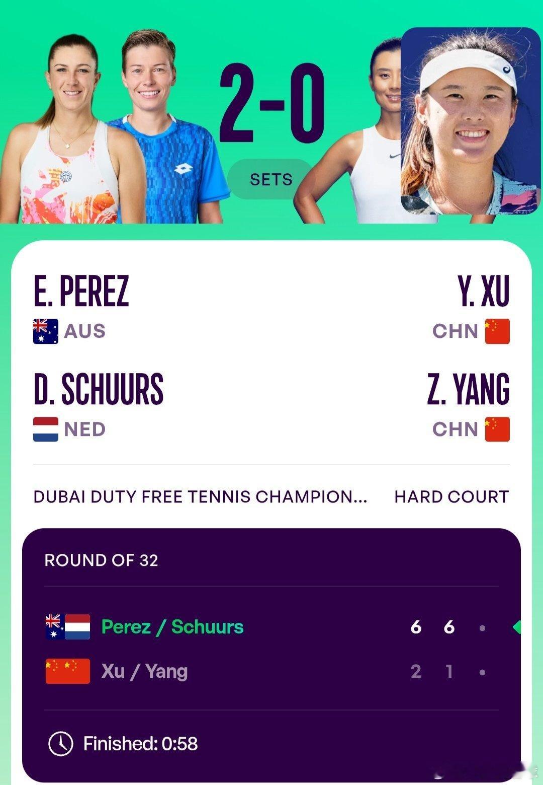 徐一璠🇨🇳/杨钊煊🇨🇳2-6/1-6不敌佩雷斯🇦🇺/斯楚尔斯🇳🇱,无缘晋级下一轮。