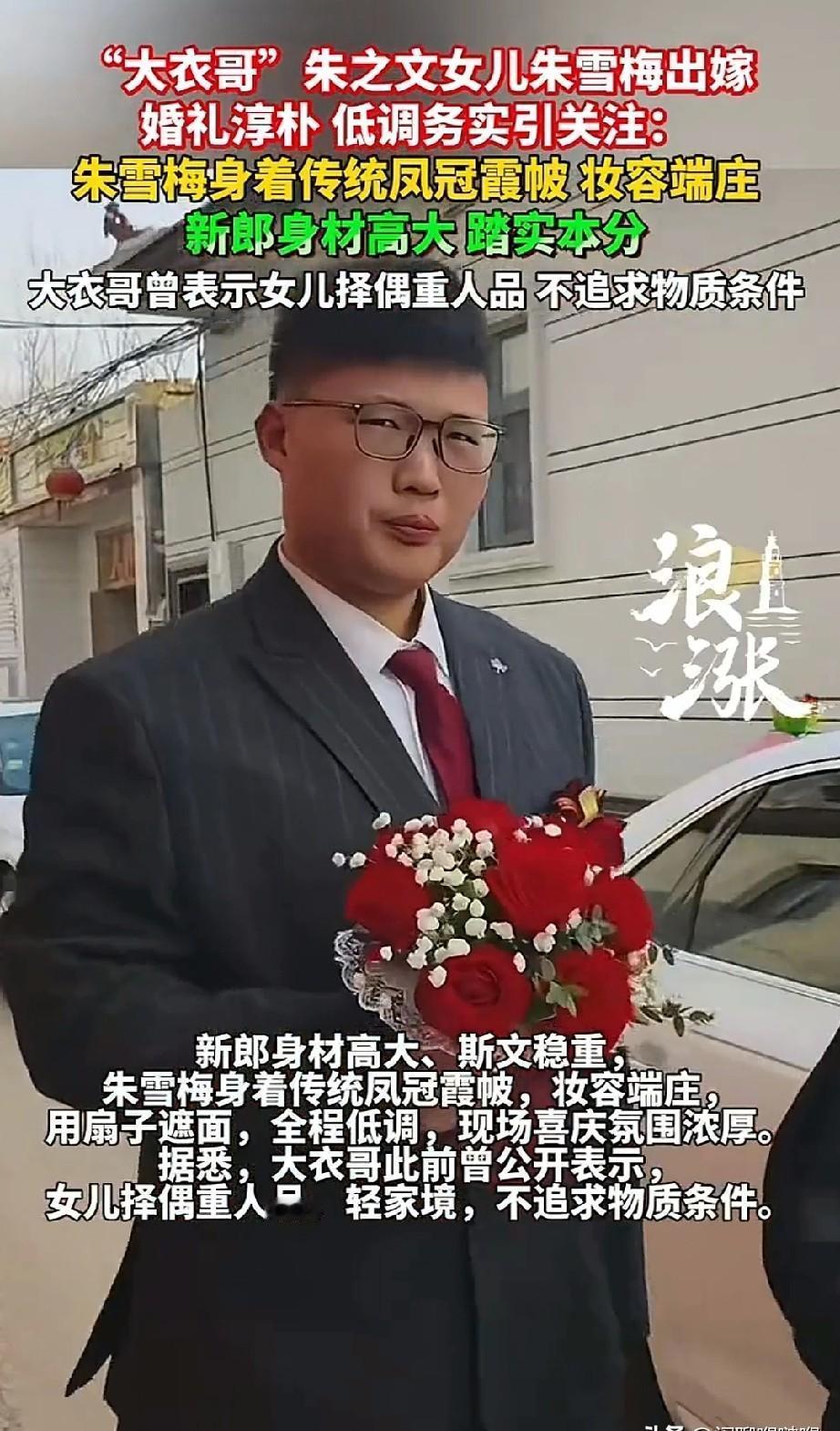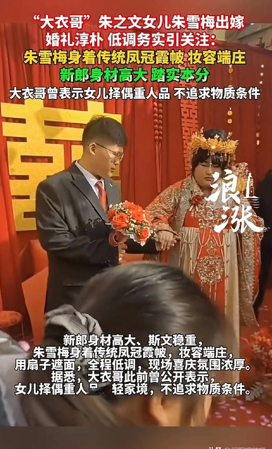 大衣哥女儿新婚,你以为是嫁豪门? 错了。 嫁了个“普通人”,朱之文为何笑得比谁都开心? 朱雪梅的婚礼,新郎没有豪车簇拥,只有憨厚笑容。 新郎来自普通农村,却让朱之文直言:“比嫁给有钱人更踏实! ” 他曾私下表态:女儿嫁妆,绝不含糊,房子、存款早已备好。 儿子朱单伟的前车之鉴,一场喧嚣的婚姻最终走向崩塌。 儿媳陈亚楠曾借力直播,流量与争议并存,最终一地鸡毛。 大衣哥看透了虚华,他要的是女儿的“安稳”,而非“体面”。 这份不追求门当户对,反而强调人品的务实,戳中了多少父母的心? 真情,在金钱面前,究竟还值几何?