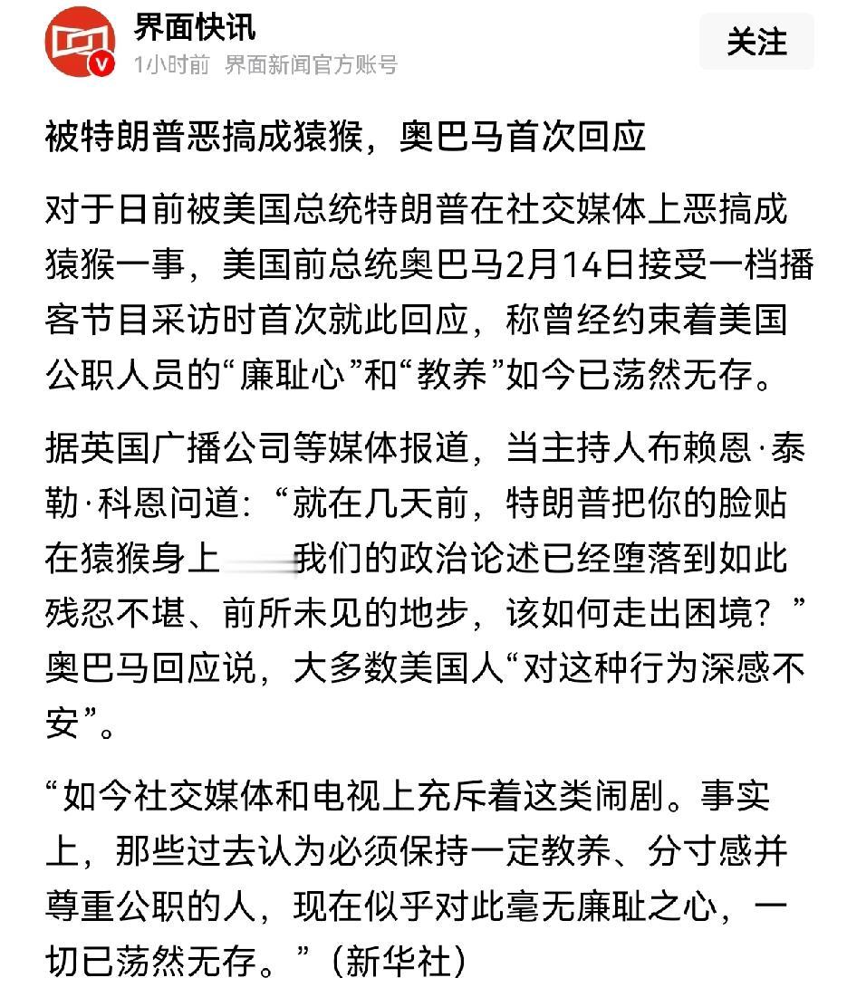 奥巴马公开回应被特朗普恶搞成猿猴视频,称这种行为说明曾经约束着美国公职人员的廉耻心和教养已经荡然无存。 高超的政治家果然不一样,骂人都不带一个脏字。奥巴马与特朗普的风格迥异,在这件事情上集中体现出来了。一个是含蓄,一个是张扬。一个有话拐弯抹角,一个不爽直接开骂。有时觉得美国人民选择特朗普也是正常的,你看惯了那些严肃含蓄的政治人物,突然看到这个张扬又不受约束的政治人物,大概率也会眼前一亮吧。