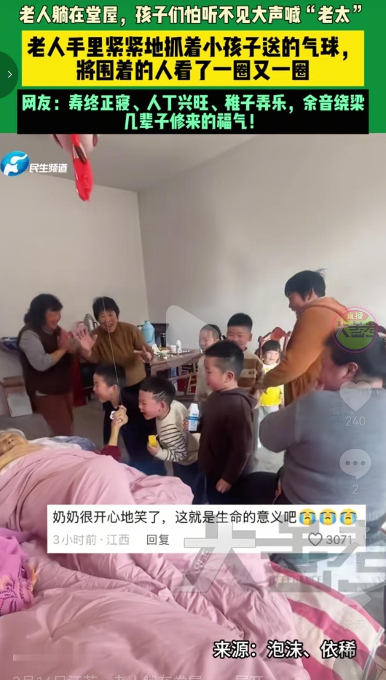 这才是中国人最想要的圆满吧!2月14日,江苏一户人家的堂屋里,一位老太太躺在床上,身边围满了儿孙,此时此刻,老人的生命已经到了最后时刻。 视频中,她的手紧紧地攥着一根线,线的那头是个红色的卡通气球。这个气球是重孙子、重孙女们凑钱给她买的小玩意儿。 孩子们怕她听不见,凑到床边,一个个扯着嗓子喊:“老太!老太!” 老太太的眼睛听到了声音,慢慢睁开,浑浊的目光扫过一圈又一圈围着她的人:有笑出眼泪的儿媳妇,有拍着手的孙媳妇,还有一群蹦蹦跳跳的重孙辈。 她嘴角动了动,好像笑了一下,又把气球往自己怀里攥了攥。 满屋子没有哭声,全是笑声和喊声。 网友看到后评论说:“寿终正寝、人丁兴旺、稚子弄乐,余音绕梁,这是几辈子修来的福气。” 还有的网友说:“在热闹和延续里离开,这是对这个世界最好的告别。” 要说这事,看完心里真的又暖又酸,这哪是普通的告别啊,这分明是咱们中国人最盼的那种“圆满”! 你想啊,老太太这辈子,可能没出过远门,没读过多少书,没赚过大钱,甚至连智能手机都玩不明白。可她活成了一大家子的根。 到最后这一步,身边不是冷冰冰的仪器,是满屋子的儿孙。孩子们扯着嗓子喊“老太”,怕她听不见;她攥着重孙送的那个红气球,那是她这辈子最金贵的“宝贝”。 没有撕心裂肺的哭,全是热热闹闹的笑。这笑不是不难过,是知道她这辈子没白活——她把孩子拉扯大,看着他们成家,又看着孙子重孙一个个蹦出来,她走的时候,血脉还在延续,爱还在延续。 现在好多人总说“养老难”“送终难”,可难的从来不是钱和房,是这份“人丁兴旺、稚子弄乐”的烟火气。 我们总在追名逐利,可到最后才发现:这辈子最值得的事,不是你赚了多少,而是你走的时候,有人真心舍不得你,有人笑着喊你的名字,有人记得你爱吃的那口糖,记得你给他们讲过的老故事。 这才是真正的“养老送终”——不是把人送走,是把爱和根,好好地传下去。 大家觉得呢?欢迎大家评论区讨论留言。