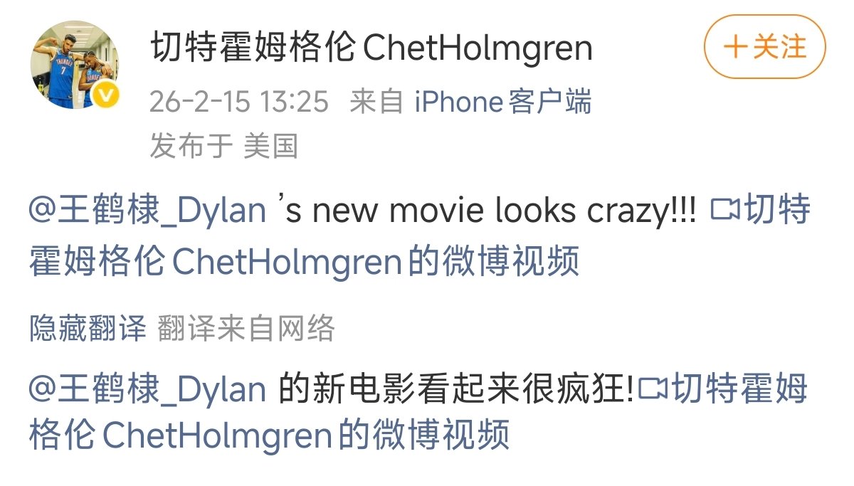 王鹤棣回复霍姆格伦霍姆格伦说王鹤棣看起来很疯狂 王鹤棣回复霍姆格伦:谢谢兄弟!期待你在球场上的精彩表现,祝你比赛好运!