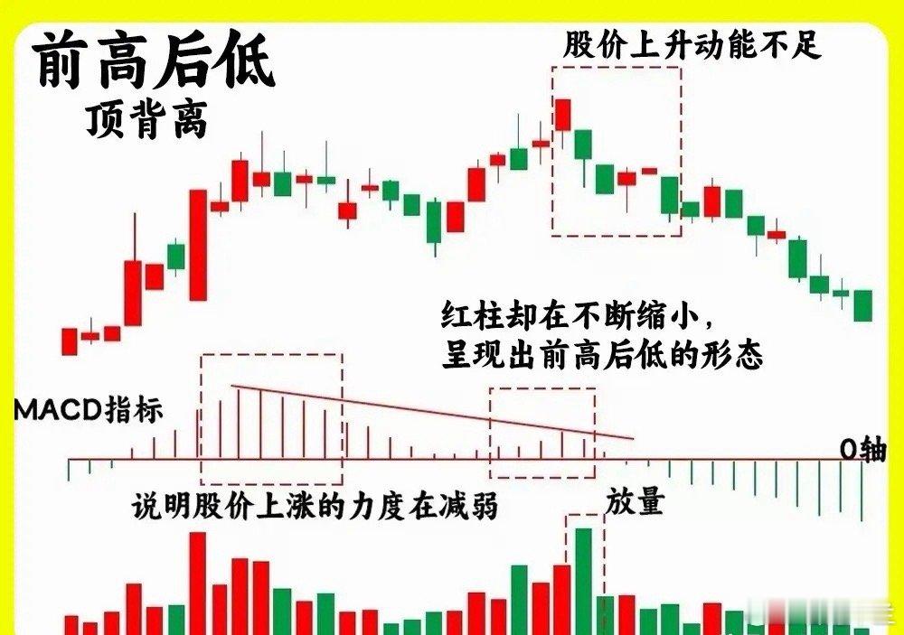 注意了!市场上有这么一句话,可以说是MACD指标中的核心,那就是前大后小;前高后低。他们代表着什么意思呢?看懂这两句话,就可以看懂MACD的高低点,那怕是新手小白也能轻松看懂,很适合散户朋友。MACD指标号称指标之王,很多人都认为它有比较重的滞后性,其实那是我们不会真正的了解它。前大后小在MACD中绿柱出现,前面的绿柱面积很大,而后面的绿柱比较小,就形成前大后小的绿柱形态,这样的形态出现,代表着市场抛压的变化。前面的股价跌的越狠,那绿柱就会越长,绿柱越小,代表的股价抛压变少,这就是典型的抛压释放从强到弱的一个表现。所以一旦股价在低位出现前大后小的绿柱,同时股价还在继续创新低,这就是MACD的底背离。当然一次背离还会有二次背离的情况。这一点一定要知道。等后市快慢线形成金叉,说明背离要结束了。这就是完整的前大后小前高后低股价经常长时间的上涨以后,MACD指标的红柱很长,股价继续创新高,而红柱的和之前对比,出现变短,就形成了红柱,前面的很长,后面的很大,这就是MACD指标顶背离。说明市场动力出现变弱,如果此时出现放量滞涨,那就有可能是主力出货了。前大后小和前高后低,他们的位置很重要,一个在低位出现底背离,另一个是在高位出现顶背离。好了!以上就是今天的全部内容了!下方我们对应的案例图,建议顶底背离和案例一起看,你就能轻松看懂,MACD指标核心。希望对大家有启发,也是最为基础的内容,一定吃透。我们下期内容再见