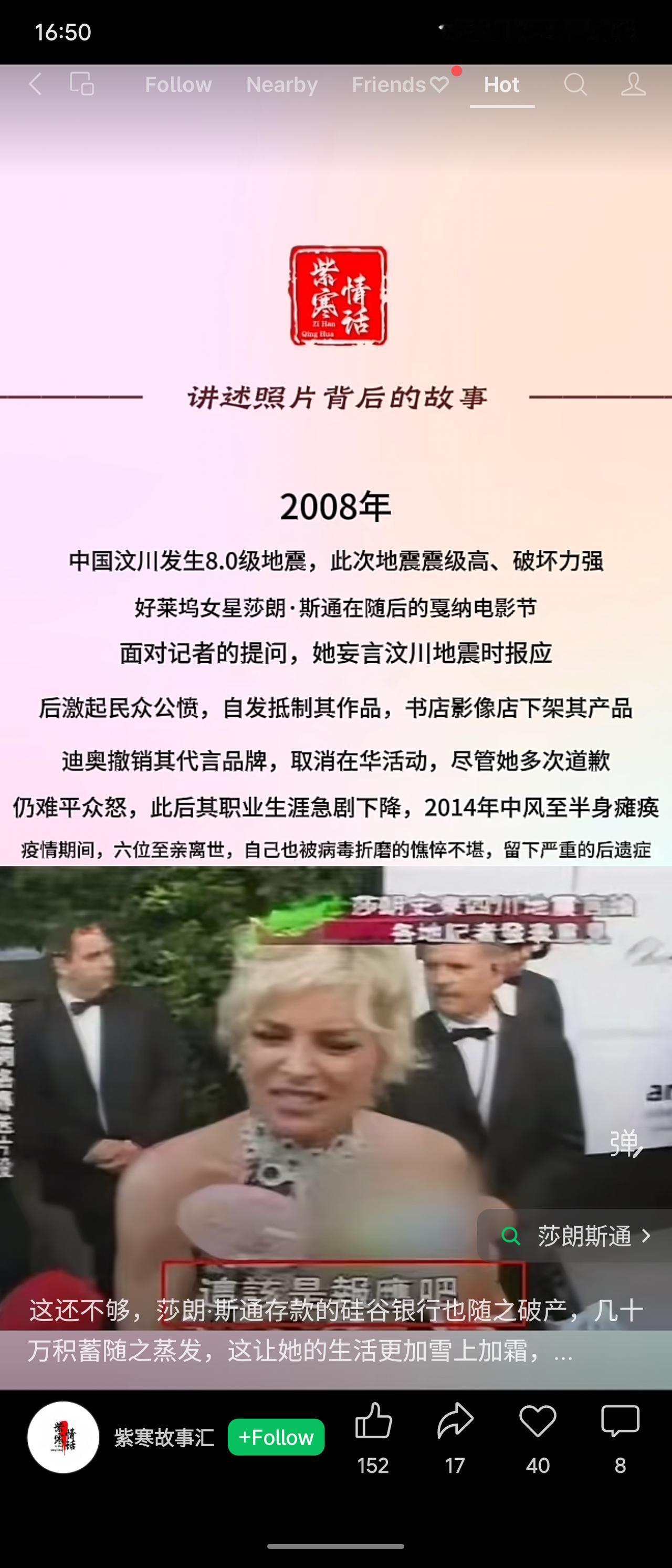 2008年莎朗·斯通妄言汶川地震是“报应”,遭中国民众抵制、迪奥解约,事业尽毁。此后中风半身瘫痪,六位至亲因新冠离世,存款随硅谷银行破产蒸发——命运回响,一报还一报。