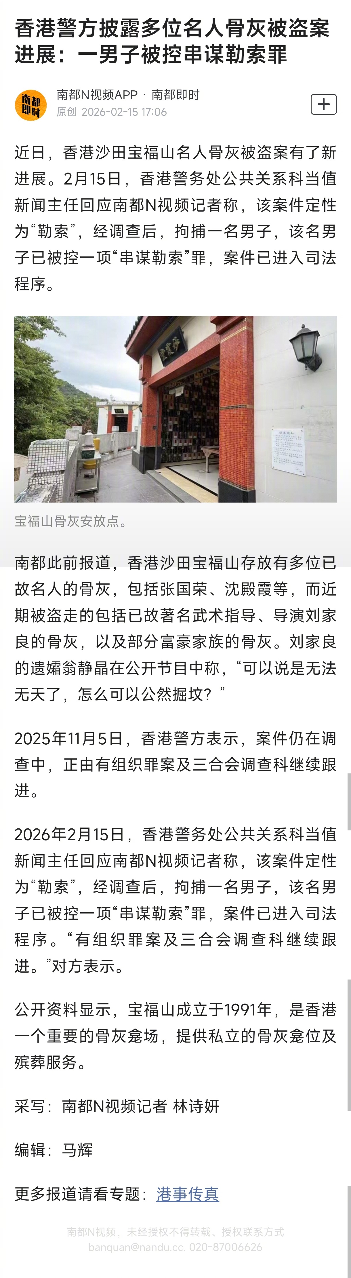 #香港警方披露名人骨灰被盗案进展#【香港警方披露多位名人骨灰被盗案进展:一男子被控串谋勒索罪】近日,香港沙田宝福山名人骨灰被盗案有了新进展。2月15日,香港警务处公共关系科当值新闻主任回应南都N视频记者称,该案件定性为“勒索”,经调查后,拘捕一名男子,该名男子已被控一项“串谋勒索”罪,案件已进入司法程序。