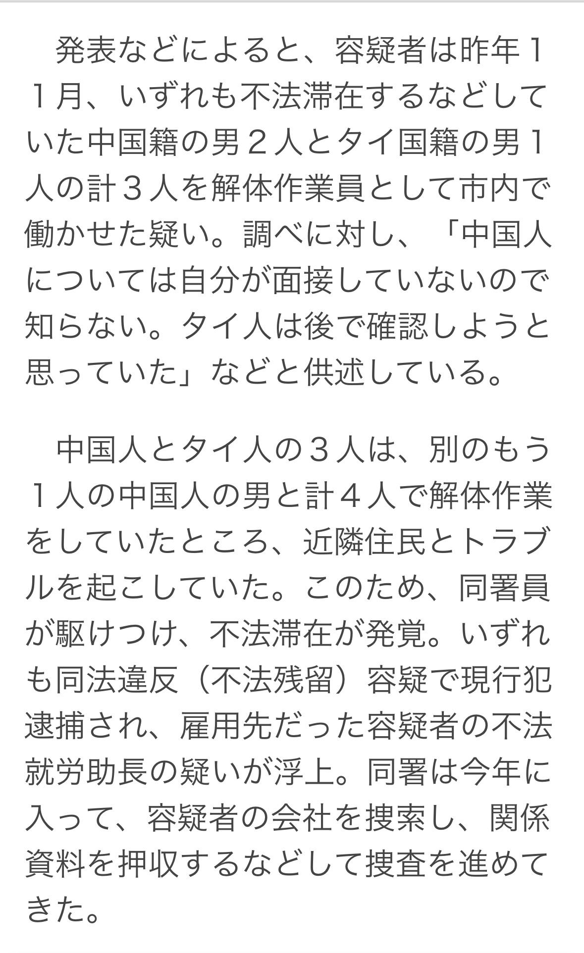 去年11月,三个中国人和一个泰国人在日本的拆迁工地干活,因为和附近的居民打进来了,于是招来了警察。几个人都是非法滞在,没有就劳资格,于是就被一网打尽! 奇怪!为什么不低调点,想赚钱就得忍吗。忍一时风平浪静,继续日赚1万円,1万円虽然不多,但总比没钱赚好吧。