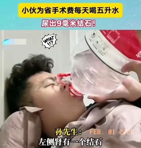 真是一个狠人啊!小伙为了省12000手术费,每天喝五升水,结果尿出9毫米结石!小伙:“尿出来的那一刻,整个人轻松了!”网友:3mm差点没疼背过去,这个9mm居然能忍的住疼! 26岁的孙先生是山东人,在上海做程序员,平时大多时间都坐在电脑前,从小就不爱喝水,有时候一上午都不喝水、不上厕所,初中的时候就查出过一颗2毫米的肾结石,后来慢慢发展成了两颗,他的父亲也有肾结石病史。2024年10月的一天,孙先生晚上睡觉的时候,突然感觉腰部传来剧烈疼痛,疼得他根本没法正常休息,只能赶紧去医院急诊。 到医院做了CT检查后,医生确诊他双肾都有结石,其中左肾的一颗结石刚好卡在了输尿管入口,这也是导致他剧烈腰痛的原因。当时医生给他开了药,后续复查时,又建议他做激光碎石手术,说这样能更快更安全地取出结石,避免结石长期梗阻损伤肾功能。 可当孙先生问清楚手术费用后,一下子就犯了难,激光碎石手术需要12000元,他刚毕业半年,工作虽然忙,但积蓄不多,一时拿不出这么多钱,再加上他心里也害怕手术,担心手术会有风险,思来想去,他决定不做手术,试着靠自己的方法排出结石。 孙先生听说多喝水能帮助排石,就下定决心要靠喝水和运动来试试,哪怕过程再难也想省下这笔手术费。从那以后,每个工作日他都会在办公桌上放一大桶水,确保自己每天能喝够5升,只有到了周末在家,喝水量才会相对少一点。除了多喝水,他还坚持每天早起慢跑,有时候跑2公里,状态好的时候就跑5公里,就这样一天天坚持,没有间断过。 这三个月里,孙先生没少受罪,陆陆续续会感觉到轻微的腰痛,有时候疼起来也会影响正常工作和休息,但他从来没有想过放弃,一直咬牙坚持着。期间他又去了两次医院,一次是2025年1月的急诊,当时腰部再次剧痛,做了B超检查,因为受到一些干扰,医生没能看清楚结石的具体情况,第二天他又去看了门诊,医生再次建议他尽快做激光碎石手术,可他还是坚持要再试试保守治疗。 根据上海交大医学院附属仁济医院泌尿外科主任医师的说法,一般情况下,6毫米以内的结石可以考虑保守治疗,靠喝水和运动排出,8毫米的结石自由排出的概率只有20%,1公分以上的结石几乎不可能靠物理方式排出,孙先生这颗9毫米的结石,能靠喝水和运动排出,其实是小概率事件。 2025年2月2日,也就是大年初五那天,孙先生像往常一样喝水、运动,突然感觉腰部传来一阵比之前更剧烈的疼痛,疼得他无法思考,他知道,可能是结石要排出来了。他强忍着疼痛,继续喝水、适当活动,没过多久,他去厕所的时候,终于将那颗困扰了他三个多月的结石排了出来,事后他测量了一下,这颗结石足足有9毫米大。 “尿出来的那一刻,整个人轻松了!”孙先生说,排完结石后,之前一直困扰他的腰痛瞬间消失了,身体也没有了之前的不适感,那种轻松的感觉,只有他自己能体会到。后来他把自己排出的结石保存了起来,原本打算自己收藏,后来因为一个学医的小妹妹真诚请教,他就决定把结石送给那个小妹妹,让她拿去化验成分,也能帮到对方学习。 孙先生还透露,他身体里还有另一颗结石,排完这颗9毫米的结石后,他喝水量减少了一些,每天喝3到4升左右,打算最近再去医院做一次检查,听听医生的建议,再决定怎么处理另一颗结石。 这件事被孙先生拍成视频发布到社交平台后,很快就传开了,网友们看到后,纷纷留言讨论,有人说他真是个狠人,也有人被他的毅力打动。有不少网友分享了自己排石的经历,其中有网友说,自己之前排出过3毫米的结石,当时疼得差点背过去,浑身冒冷汗,根本忍不住,很难想象孙先生这颗9毫米的结石,他是怎么忍过来的,能靠喝水和运动排出来,实在是太不可思议了。 其实根据中华医学会泌尿外科学分会2024年的监测数据,有23%的患者因为过度简化“多喝水排石”的方法,延误了规范治疗,孙先生算是比较幸运的那一个,成功排出了结石,也没有出现肾功能损伤等并发症。