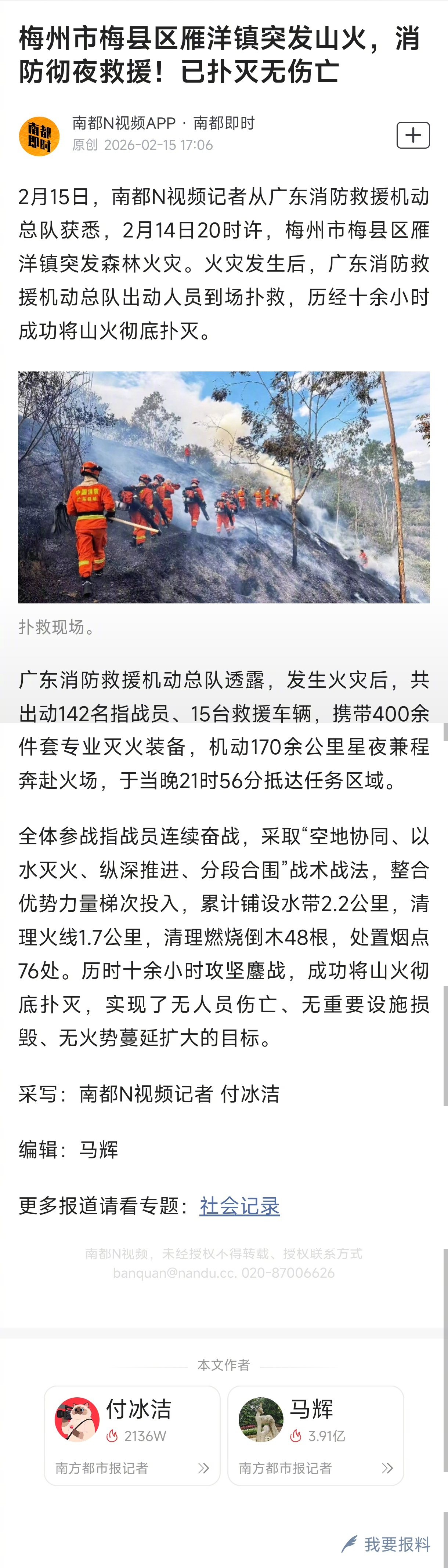 全体参战指战员连续奋战,采取“空地协同、以水灭火、纵深推进、分段合围”战术战法,整合优势力量梯次投入,累计铺设水带2.2公里,清理火线1.7公里,清理燃烧倒木48根,处置烟点76处。历时十余小时攻坚鏖战,成功将山火彻底扑灭,实现了无人员伤亡、无重要设施损毁、无火势蔓延扩大的目标。采写:南都N视频记者 付冰洁