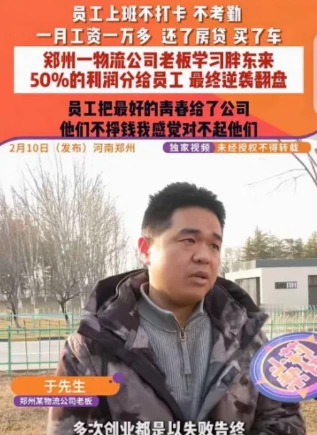 “活该你发财!”河南郑州,一男子创业失败,信用卡负债105万,他绝望了,2次想轻生,可自己有上有老下有小,死不起,他决定拼一把,开了家物流公司,学习“胖东来”,把50%利润都给员工,最终逆袭翻盘,不但把债还完,资产也变成正数,员工们每月能挣10000多,上班不打卡不考勤,还了房贷买了车。男子:员工把最好的青春给了公司,他们不挣钱我感觉对不起他们。 郑州某栋写字楼的顶层,狂风把衣角拍打得猎猎作响。于先生于那个特定时刻,心内似有惊澜涌动。此刻,他口袋里手机震动之频,竟远超他怦怦心跳,似要冲破这紧张氛围。 屏幕上亮起的是催收短信,每一个字都像钉子一样扎眼,那个冷冰冰的数字“负债105万”,成了压在胸口的一座大山。 那时候的他,甚至觉得迈出栏杆的那一步,比活下去更容易。 三年后的今天,同样是在郑州的办公室里,那个曾经想从天台上跳下去的男人,正蹲在地上小心翼翼地拆快递。 箱子内并非催收函,而是四箱厚重的礼品。寄件人一栏,写着一个在河南商界近乎传奇的名字——于东来。他的这份馈赠,似在诉说着别样的故事。 从天台徘徊者到被许昌胖东来掌门人“盖章认证”,这1000多个日夜里,他到底做对了一道什么算术题? 把时间轴拨回到他负债累累的那个至暗时刻。曾经月薪5000元的货车司机,一头扎进创业深水区,结果呛了一大口水,不仅积蓄归零,还背上了让普通家庭窒息的百万债务。 上有垂暮双亲需奉养,下有懵懂幼子待抚育,“死不起”带来的恐惧,于他而言,宛如绝境中唯一的浮木,成了支撑他走下去的最后希望。 他没有像没头苍蝇一样乱撞,而是做了一个奇怪的决定:去许昌“看病”。他两次潜入胖东来的卖场,不看商品陈列,只看人。 他盯着那些理货员和收银员的眼睛看,试图找出他们眼里那道光的来源。 诊断结果让他大受震撼:这世上没有什么穷病是治不好的,药方只有两个字——分钱。 原来,治疗老板焦虑最好的方式,不是给员工打鸡血,而是往他们卡里打钱。 回到郑州,他成立了一家物流公司,在这个赚血汗钱的行业里,抛出了一颗“核弹级”的制度:拿出50%的利润分给员工。 更疯狂的是,他不设考勤,不打卡,活干完就走人。 起初,招聘来的员工眼神里全是狐疑。在他们的职场经验里,老板画的大饼通常比脸盆还大,但能吃到的渣都没有。 直到第一个月的分红真金白银地“叮”一声到账,整个公司的空气都变了。 怀疑变成了狂热,员工们瞬间完成了从“打工仔”到“合伙人”的脑内升级。大家心里的算盘打得比谁都精:现在磨洋工,磨掉的可都是自己的钱。 没有什么比利益捆绑更有效的管理学了。曾经需要盯着干活的人,突然变成了不知疲倦的永动机。 这场关于人性的疯狂对赌,庄家和玩家都没有输。 仅仅用了三年,那个在天台上瑟瑟发抖的男人,不仅填平了105万的债务深坑,公司资产还彻底转正。 跟着他的兄弟们,月收入轻轻松松突破了10000元大关。在郑州,这意味着有人还清了房贷,有人把新车开回了家,更重要的是,他们挺直了腰杆。 当于先生辗转联系上精神导师于东来,汇报这份沉甸甸的“作业”时,那四箱回礼,就是两代“傻子老板”之间无声的共鸣。 回看现在的商业江湖,有多少老板一边裁员哭穷,一边转身就提了一辆法拉利? 他们把员工当成一次性电池,用完即弃,却还抱怨现在的年轻人不懂感恩。 于先生那句大白话,撕开了多少体面人的遮羞布:“员工把最好的青春给了公司,如果不让他们挣到钱,我觉得对不起他们。” 在这个精明过剩的年代,算计也许能赢一时,但只有厚道,才能守住一世。 有人说他傻,把一半利润拱手让人。但看着公司账户上不断跳动的正向数字,和员工脸上踏实的笑容,你不得不承认: 这种愿意主动吃亏的人,活该他发财。 信息来源:手机网易网