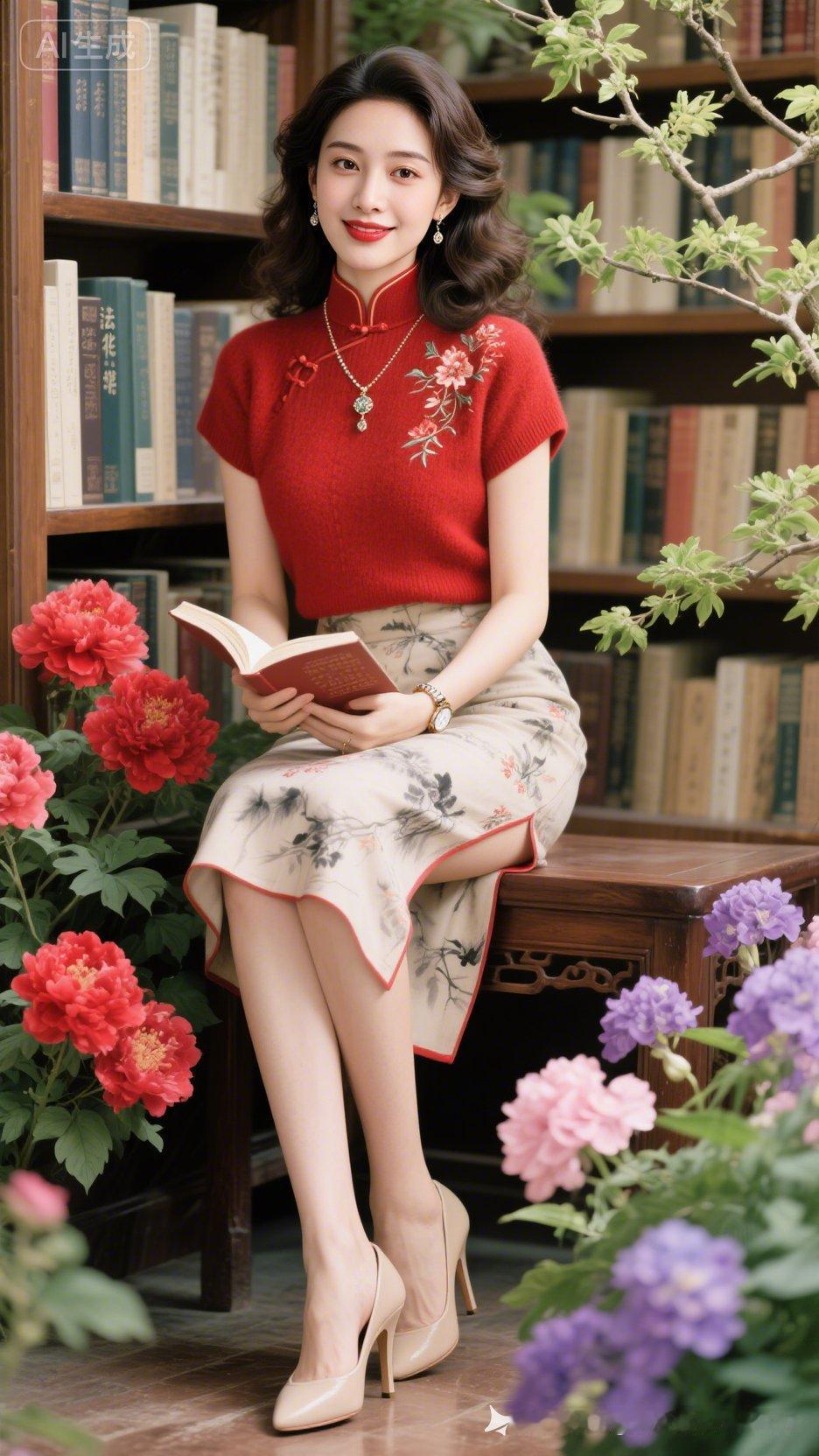 优雅阅读时光,复古旗袍与现代书籍的完美融合。