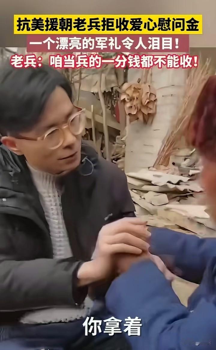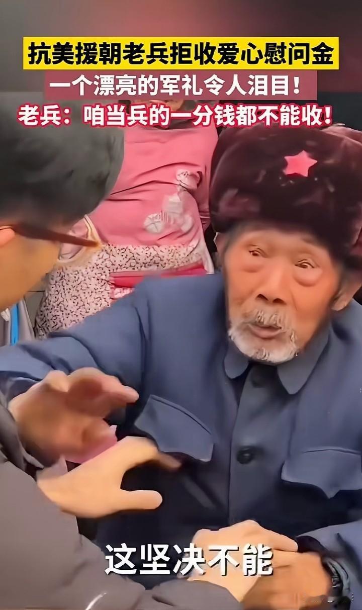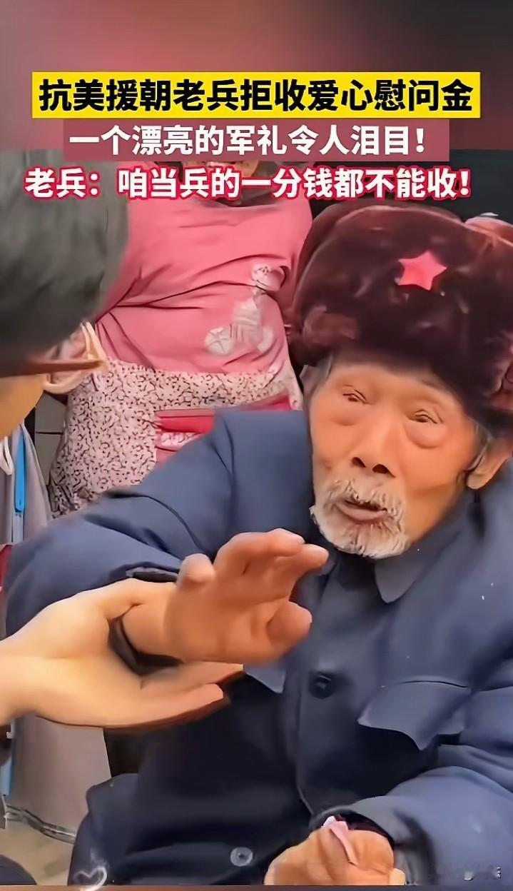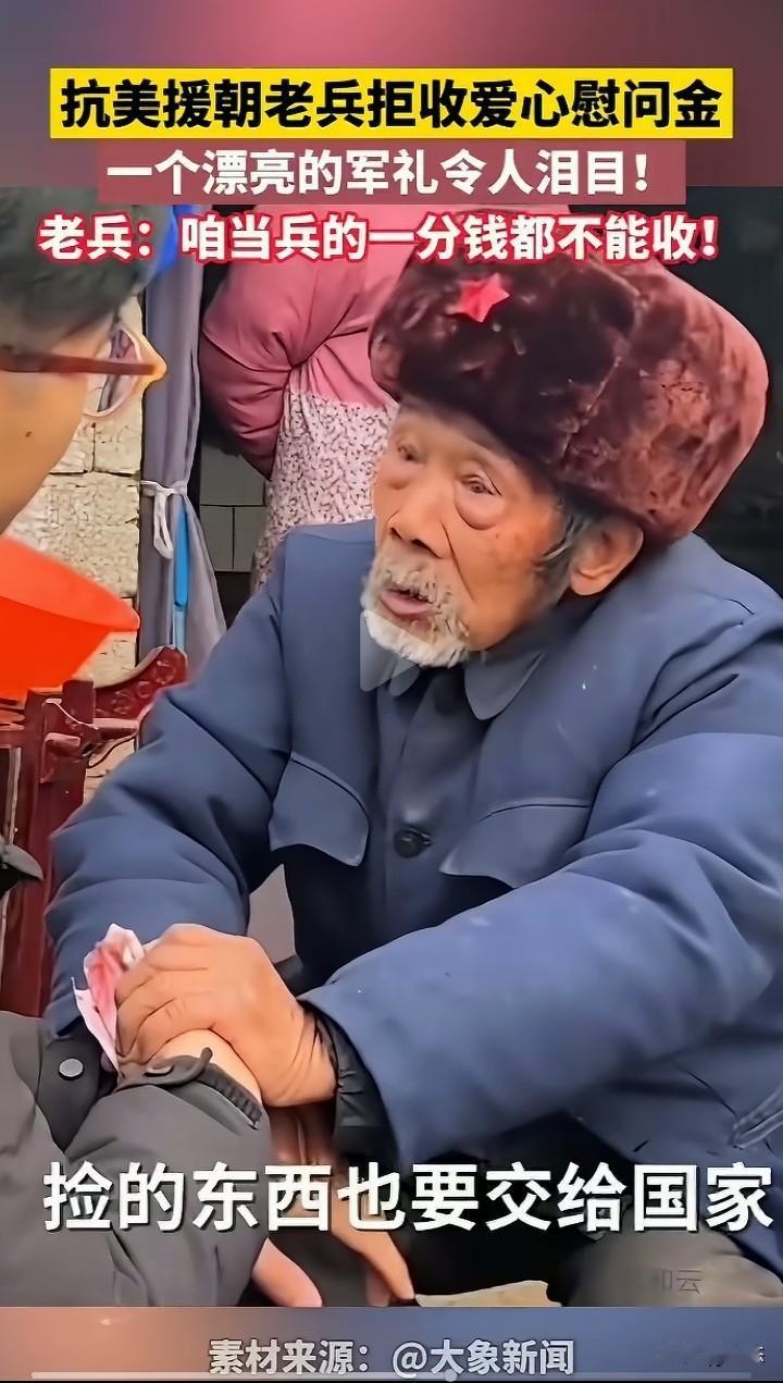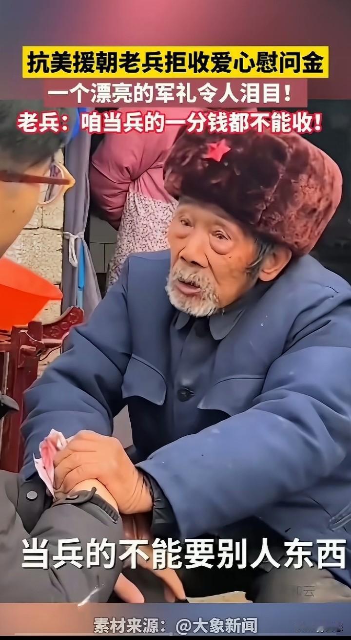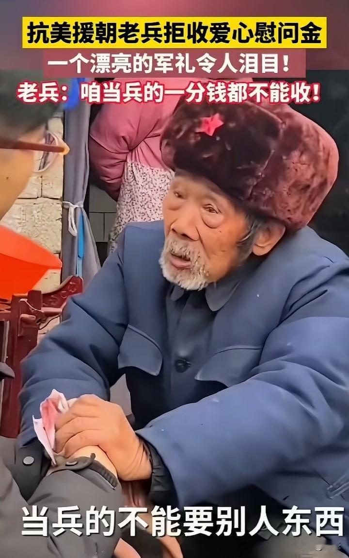 爱心人士去慰问抗美援朝老兵,没想到这位老兵坚决拒绝收慰问金,老兵称,咱们当兵的一分钱都不能收,捡的东西也要交给国家。 没有抗美援朝的老兵,也许我们还要摸索一段时间,有了他们才有了我们现在稳定安全的国家,为他们点赞!希望他们能健康长寿。 你们怎么看呢?
