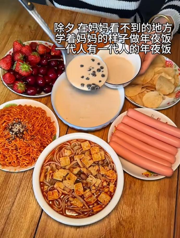 有孩子的人一定要看完我这篇微头条。 真的是一代人有一代人的年夜饭。 看起来很好笑,但仔细一想又挺心酸的。 但是问题在哪里呢? 问题在于当父母不让孩子从小去尝试做饭啊,剥夺了他们学习的权利。 孩子的学习是全方位的,长大是要生活的,不只是要考试的。 很多父母没有把这个问题想清楚,总觉得有些东西孩子长大了自然就会了。 但事情真不是那样的。 有些习惯如果从小没有养成,长大也就不会有了。 而且做家务本就是一个孩子学习生活的重要事项,不是只有课本才叫学习。 这是当父母的失职啊。 有些人还以为不让孩子做家务是爱孩子,其实是害孩子。 这不,他们想吃点好吃的东西过年,都没有办法解决。 这就是现实呈现出来的问题。 点右上角关注我,我们一起去看这个魔幻的世界