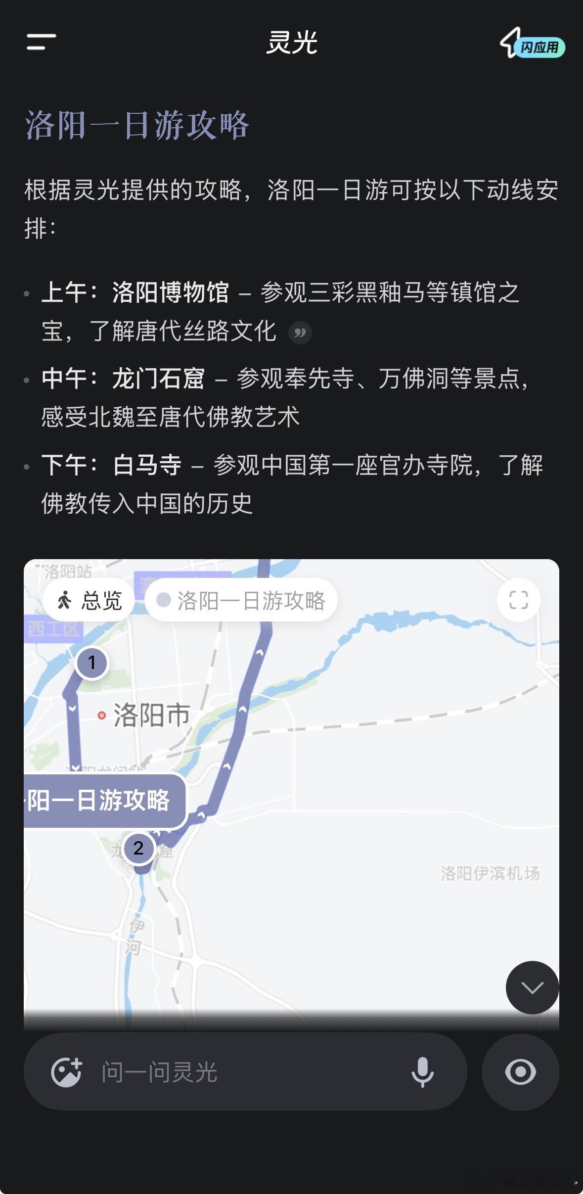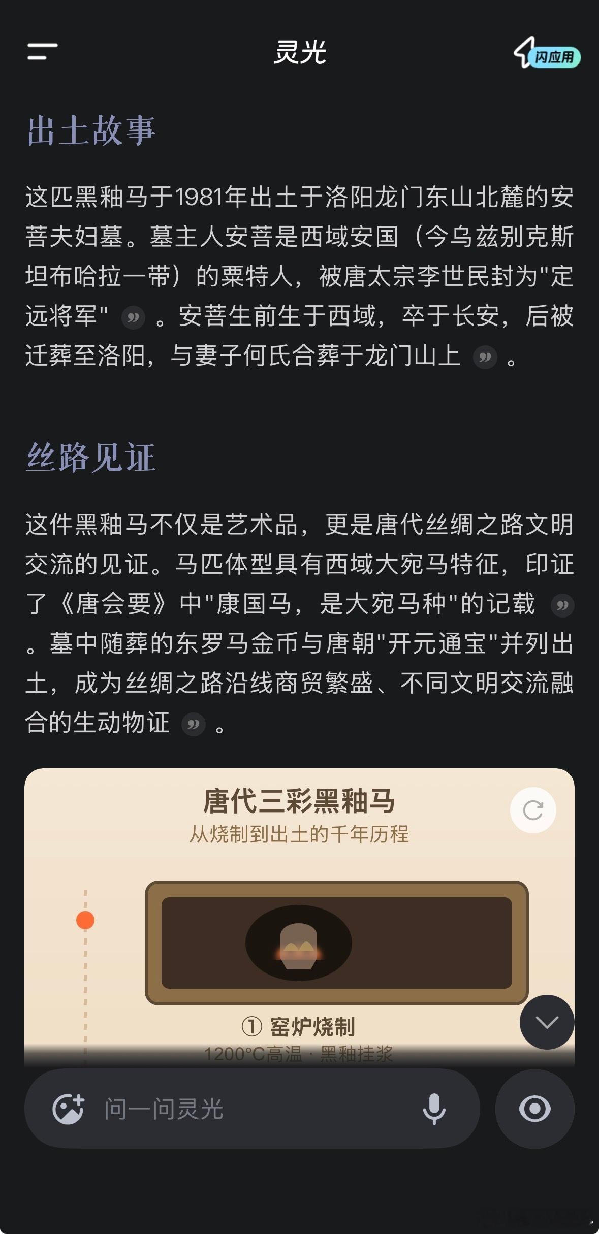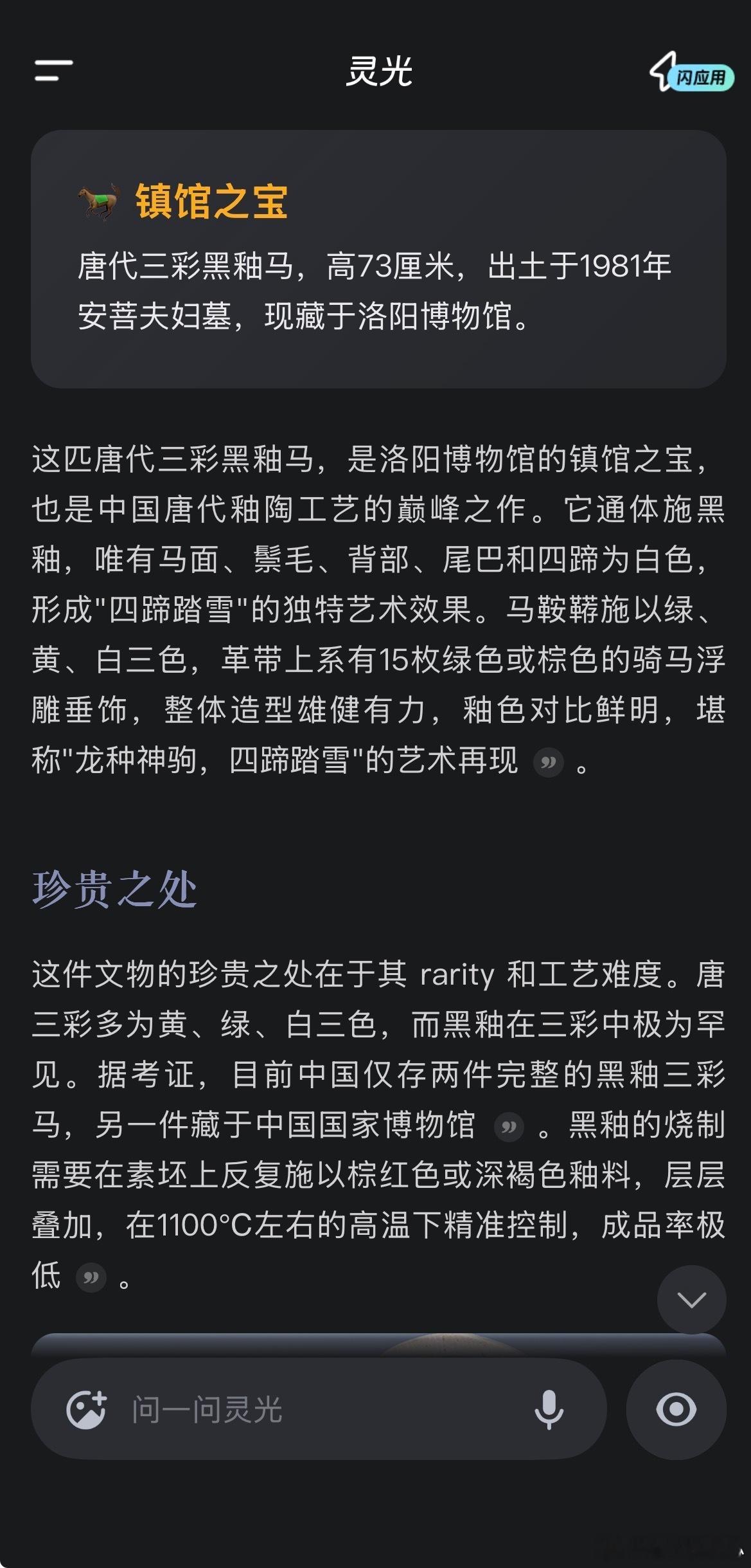 我的马年抓马之旅 谁能拒绝洛阳博物馆这匹自带高光的黑釉马啊!问了灵光这件镇馆之宝的故事,才知道它是唐代黑釉瓷器的巅峰之作,连它的出土故事、烧制工艺的难得之处都给我讲得明明白白,还做了份洛阳博物馆的打卡攻略,连龙门石窟、白马寺的顺路动线都安排好了,洛阳一日游直接抄作业! 灵光带你去抓马