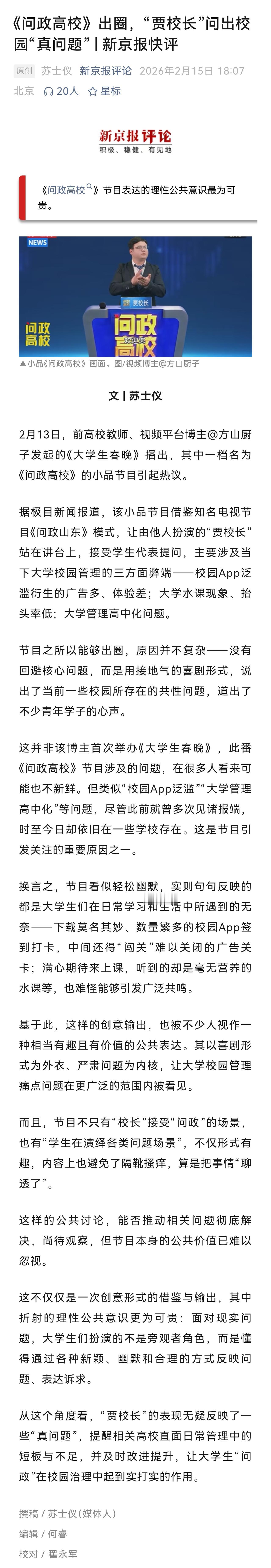 APP泛滥、水课、大学高中化这些问题,小品节目关注固然好,但不能止于吐槽。APP泛滥这个问题相对好解决;水课问题,如果不改革对大学教师的评价体系,并实行宽进严出,也难杜绝;至于大学高中化,近年来则有加剧趋势,这貌似大学的问题,而实质是家庭教育和社会问题,家长和社会都把大学生当小孩,把大学变为无限责任主体,大学怎么办?