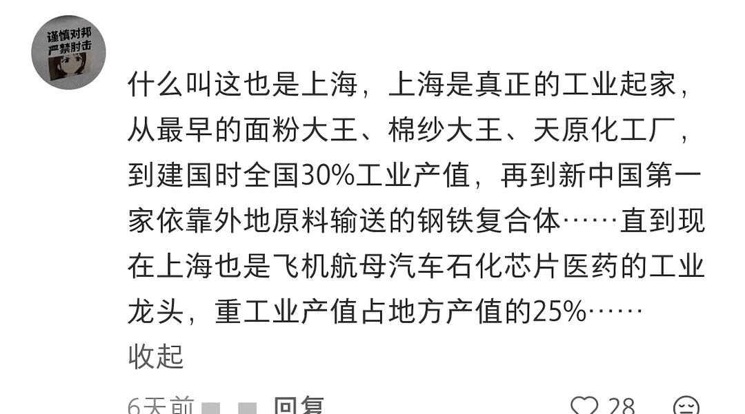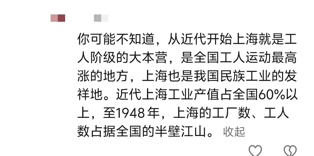 上海才是中国又红又专的城市,是近代中国光明的摇篮。作为近代中国最大的文化中心,上海拥有光荣的革命传统,承载着厚重的红色基因。 🌟 上海是中国工人运动的发源地,是中国工人阶级真正的大本营。 据《上海通史》记载,近代上海工业产值占全国60%以上。 “她是中国工业中心,是民族资本最为集中的地方,1933年民族工业资本占全国的40%,1948年工厂数、工人数占全国50%以上。” 🌟 我想每一位读懂中国近现代史的人,都会忍不住对上海这座城市抱有油然而生的敬意和温情。 上海 城市
