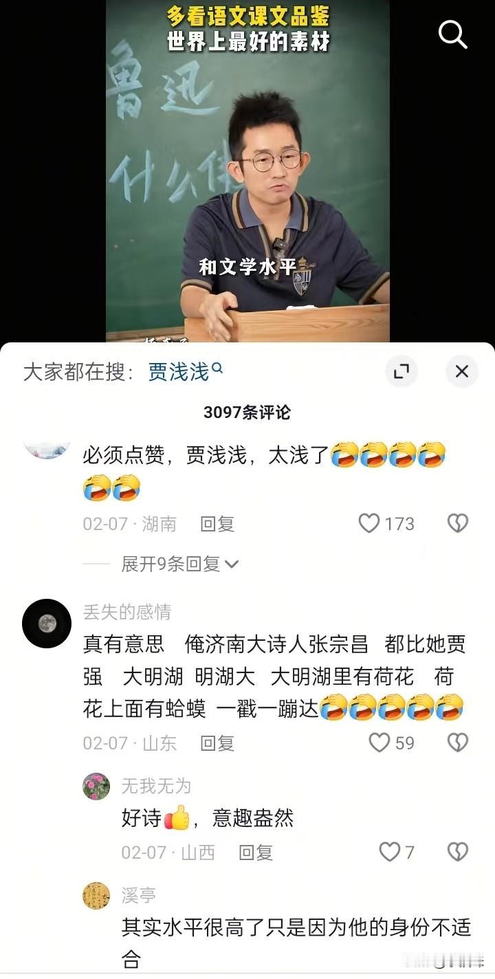 这几天,被杨奇函讲语文给迷住了,半辈子了,开始学习小学语文了,还挺上瘾。 杨奇函口才挺厉害,天天在网上讲语文,说话语速也快,听着挺过瘾。 刚刚看他提起贾浅浅,说她不算诗人。 要说评论区都是人才,说有个济南人做了一首诗,都比贾浅浅强多了。 大明湖 明湖大 大明湖里有荷花 荷花上面有一蛤蟆 一戳一蹦跶。 哈哈,也是,就这首诗也甩贾浅浅几条街。 家长可以让孩子听听杨奇函讲语文,还不错。