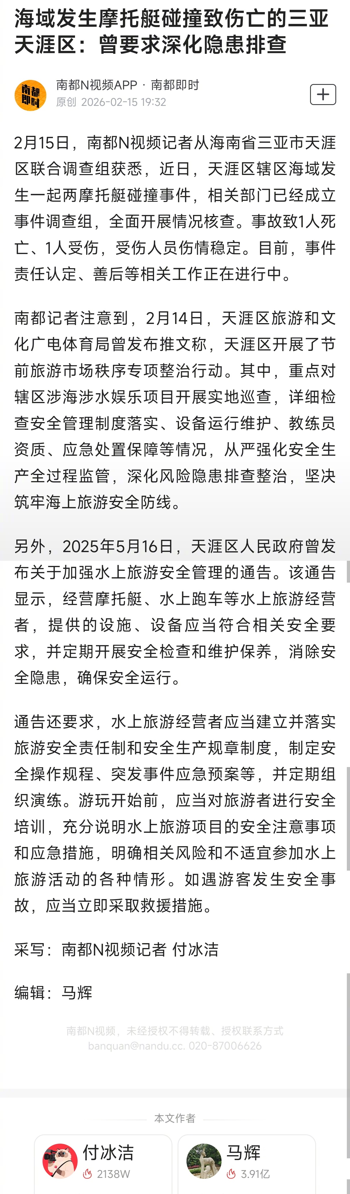 #三亚摩托艇碰撞致1死1伤#【海域发生摩托艇碰撞致伤亡的三亚天涯区:曾要求深化隐患排查】2月15日,南都N视频记者从海南省三亚市天涯区联合调查组获悉,近日,天涯区辖区海域发生一起两摩托艇碰撞事件,相关部门已经成立事件调查组,全面开展情况核查。事故致1人死亡、1人受伤,受伤人员伤情稳定。目前,事件责任认定、善后等相关工作正在进行中。