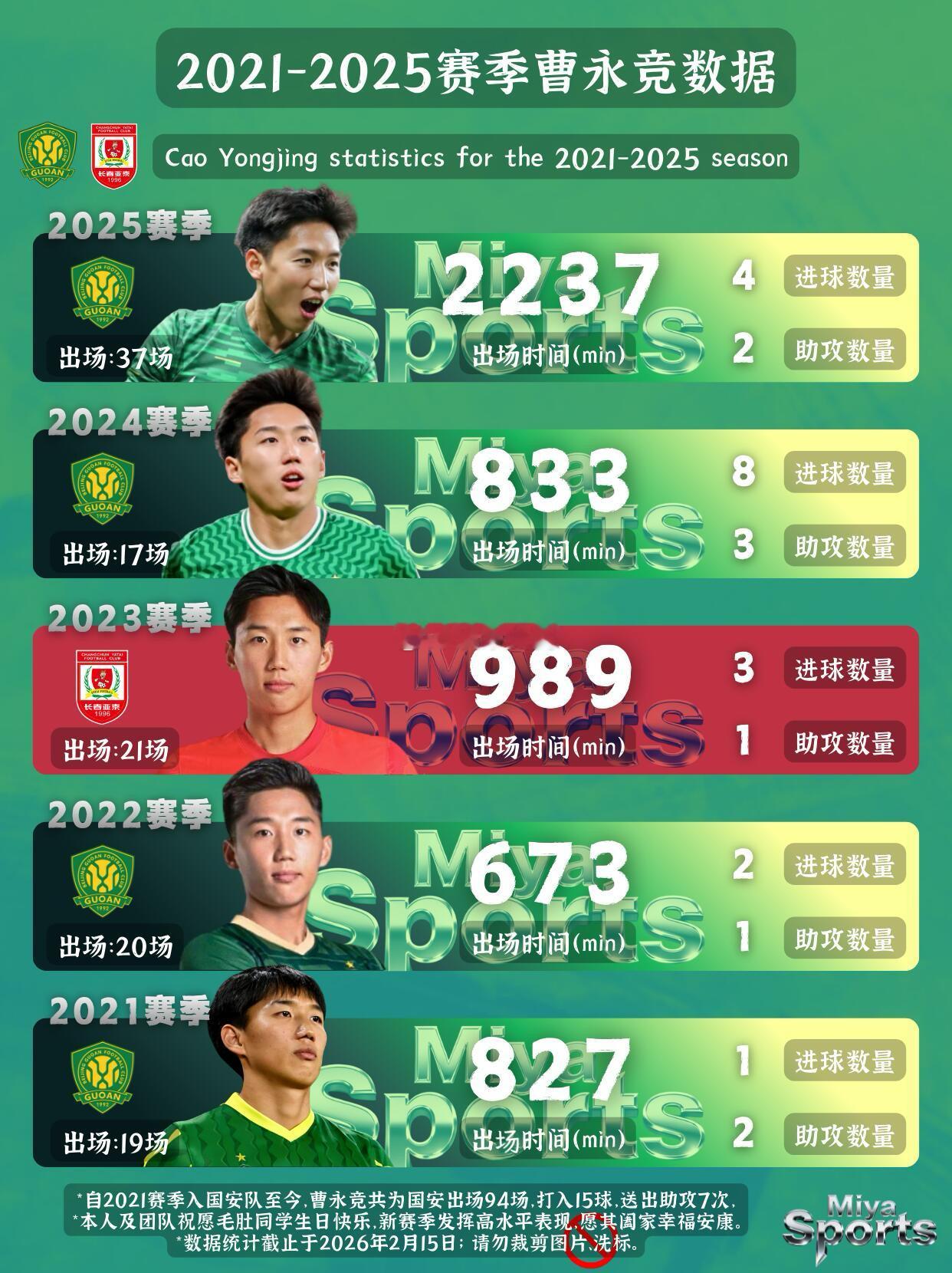 今天是“毛肚”曹永竞29岁生日🎂,先祝他生日快乐!作为2021赛季加入国安的球员,一转眼也陪伴球队走过好几个赛季了👣。小编整理了他这几年的数据,说实话真的有点意外📊。之前小编总觉得他早期存在感不算强,2021、2022赛季出场时间也不多。之前也写过很多他的笔记,不少球迷说,曹永竞2025赛季没有2024赛季那么亮眼,但小编觉得,这其实是角色定位的转换。🫡大家不妨去看看他2025赛季的出场时间和抢断数据,他在场上承担了更多球队战术工作,不能再用2024赛季的进球表现来简单衡量他。2023年租借长春亚泰的历练,也让他更加成熟稳重💪。2025赛季他出场时间达到2237分钟⏱️,在队里稳居前列。从当年的新人,到如今球队中场的重要一员,再到国家队的常客,这份坚守和努力,国安球迷都看在眼里,也真心为他感到欣慰❤️。小编最近也收到不少球迷说:曹永竞主打右边前卫,恩科洛洛到来,会不会挤压他的出场时间?其实曹永竞也能换到其他位置继续首发🔄。你认为新赛季他依旧会是国安的稳定首发吗?