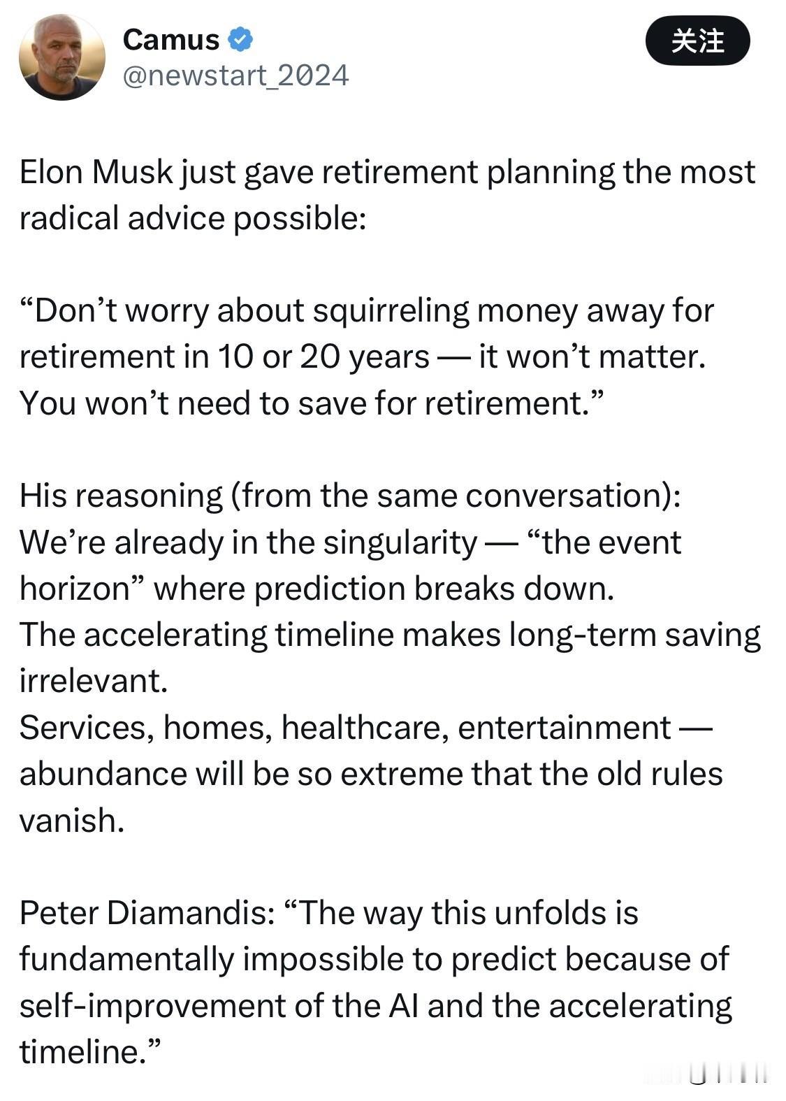 在 2026 年 1 月播出的《Moonshots with Peter Diamandis》播客节目中,马斯克直言:“我的一个建议是:别操心为 10 年或 20 年后的退休存钱了,那将变得毫无意义。” 这是个颇具颠覆性的建议。 听起来像科幻? 他说这是数学。 AI和机器人会让劳动成本趋近于零。 生产力会无限大。 稀缺性这个概念本身会消失。 那么你为之储蓄的那个世界,也就不存在了。 这套理论,听起来很像某些全球主义精英推销的“大重构”蓝图。 他们承诺一个富足的未来。 但代价是什么? 全民基本收入(UBI)听着很美。 可这会不会是新的控制手段? 当生产资料和技术被少数人掌握,普通人靠“发钱”生活,我们还剩下什么? 人的价值和尊严从哪里来? 马斯克认为,唯一剩下的稀缺品,是“意义”。 当生存不再是问题,寻找生命的意义就成了新问题。 这个“富足时代”的经济法则,无论你信不信,它都在执行。 但这个新世界的规则由谁来制定? 这才是问题的核心。 传统的储蓄和投资模型,建立在稀缺经济和稳定的社会结构上。 如果这个根基动摇了,我们现在的所有规划,是不是都成了沙上城堡?