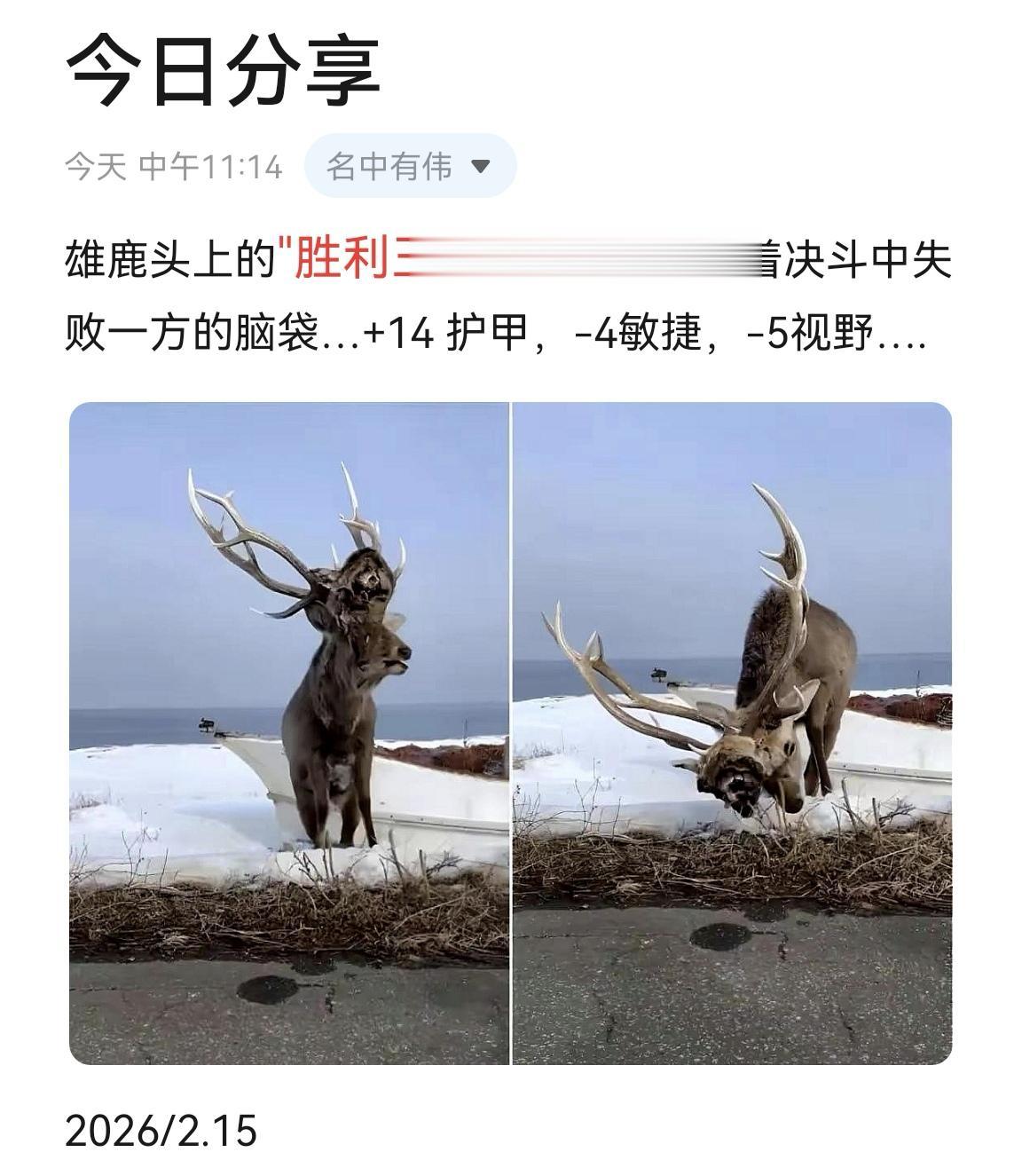 雄鹿头上的"胜利王冠":一头雄鹿顶着决斗中失败一方的脑袋…+14护甲...