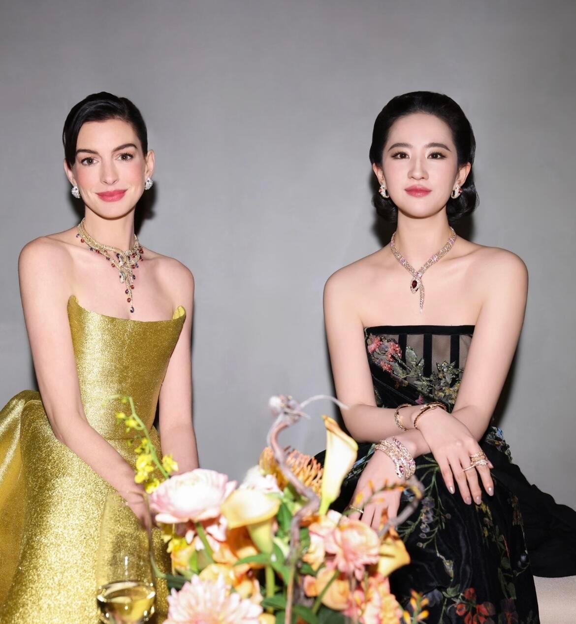刘亦菲和安妮海瑟薇同框,完美诠释了“你有你的西方骨,我有我的东方相”。安妮海瑟薇明艳大气,刘亦菲则清冷疏离,东西方审美的差异在这一刻具象化了。